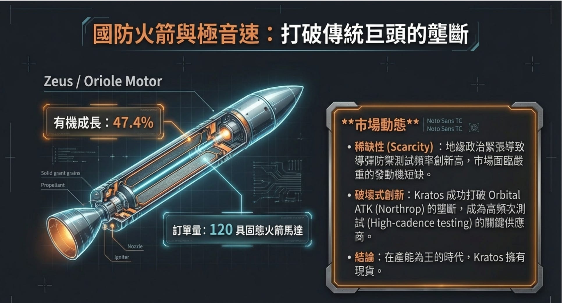 Kratos 宣布目前有 120 具 Zeus (宙斯) 和 Oriole (黃鸝) 固態火箭馬達 (SRM) 的在手訂單。在全球極音速武器 (Hypersonic) 測試與飛彈防禦系統需求井噴的當下,固態火箭馬達是極度稀缺的戰略資源。Kratos 成功打破了 Orbital ATK (被 Northrop 收購) 等傳統巨頭的壟斷。