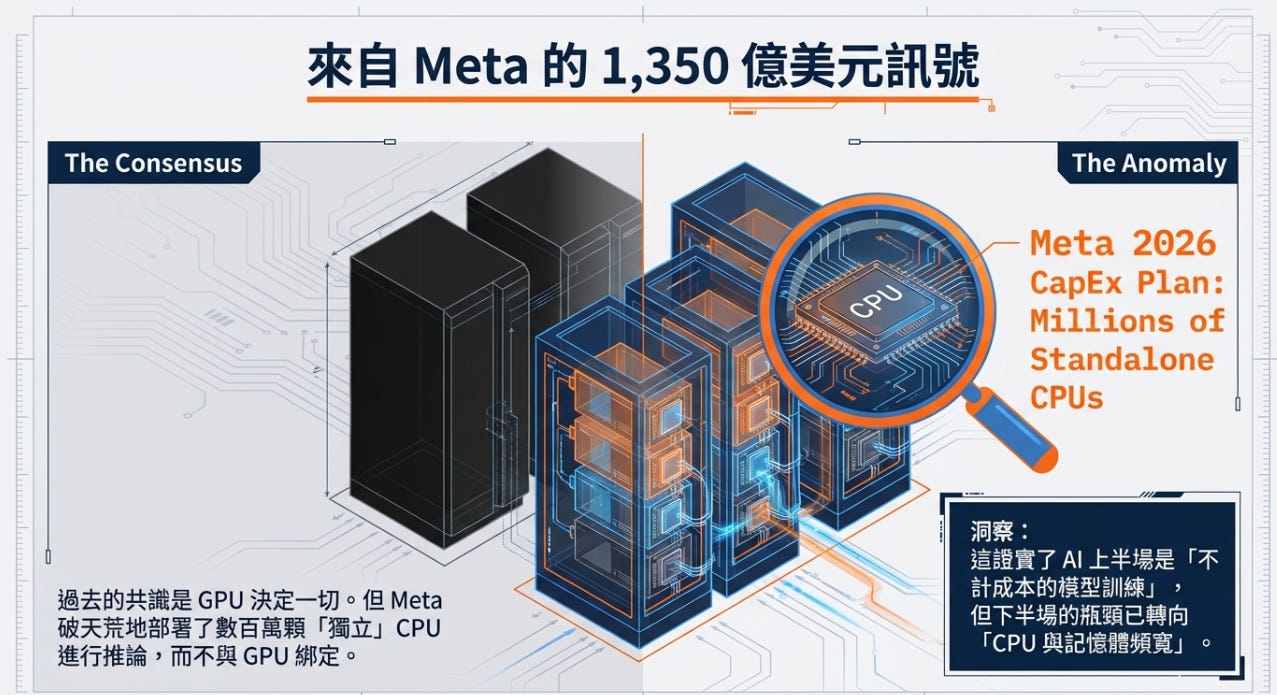Meta 狂買 CPU 背後的驚人訊號:Agentic AI 時代來臨,這 4 大板塊將接管 AI 下半場的財富分配!當大家還在搶買 GPU,聰明錢已經轉向解決「記憶體牆」與「傳輸塞車」的隱形霸主。大叔美股筆記 Uncle Stock NotesFeb 22, 2026∙ Paid153115Share這週AI 基礎建設領域發生足以改變未來三年投資版圖的產業轉折:「Agentic AI(代理型 AI)」正在徹底改寫資料中心的硬體架構。Meta 破天荒地在 1,350 億美元的 2026 年資本支出計畫中,部署了數百萬顆「獨立的」Nvidia Grace CPU 來做推論,而不與 GPU 綁定。這證實了我們強調的觀點:AI 的上半場是「不計成本的 GPU 模型訓練」,但 AI 的下半場,「CPU 與記憶體頻寬」決定推論成本與效率的真正瓶頸。Continue reading this post for free, courtesy of 大叔美股筆記 Uncle Stock Notes.Claim my free postOr purchase a paid subscription.