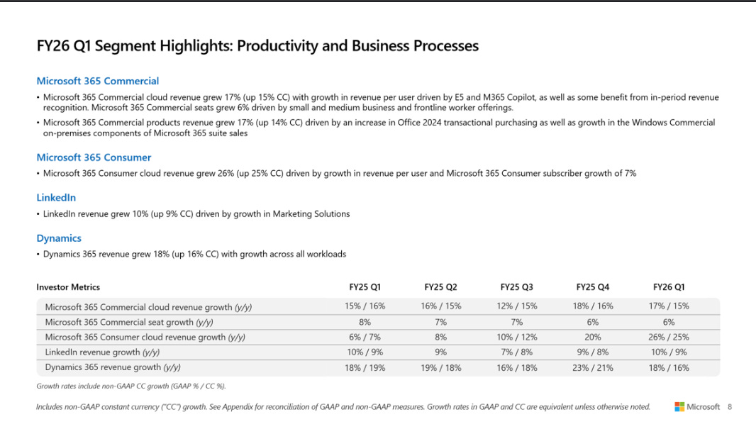 Microsoft 365 消費者雲 (Consumer):同比增長 26%。