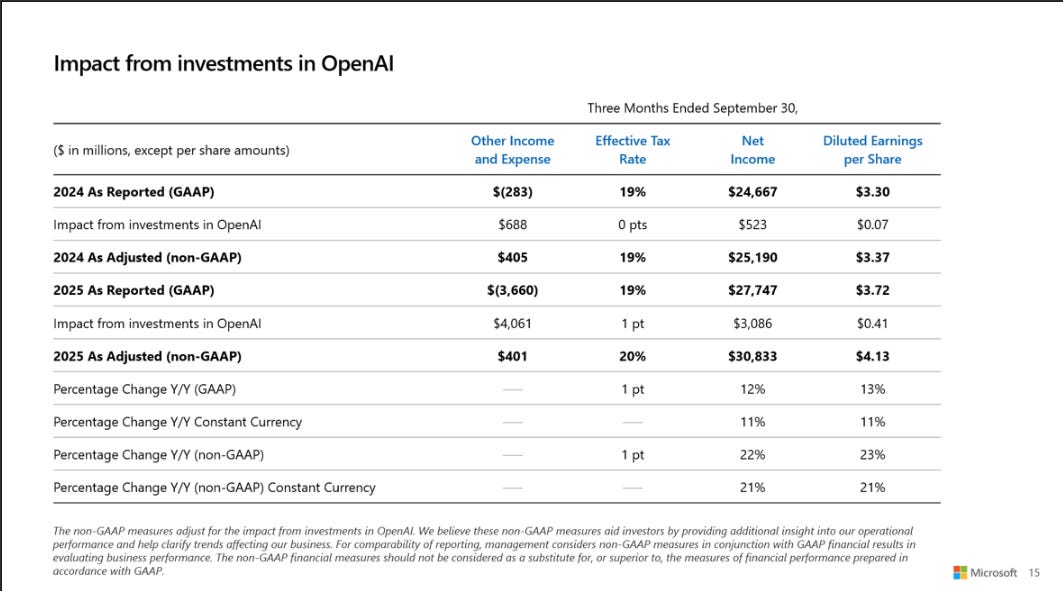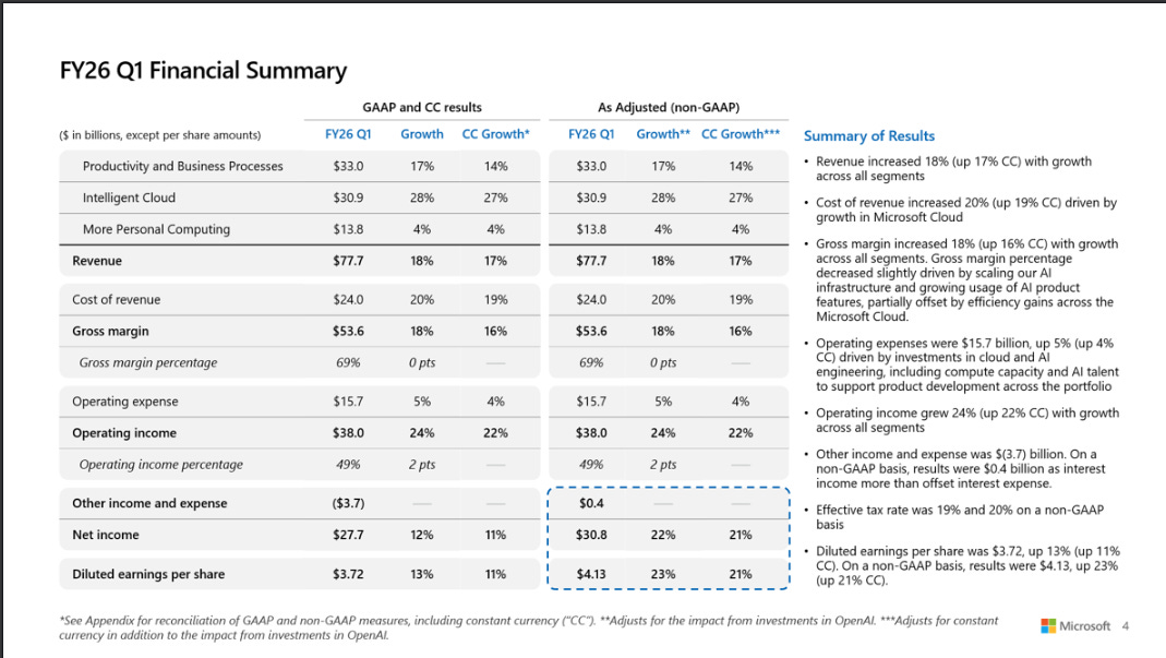 2025 年 10 月 28 日,微軟端出了分析師集體摔筆的財報—2026 財年第一季業績根本是「開門爆」。在全球企業像搶紅包一樣搶著導入 AI 的大背景下,這季營收來到 777 億美元,年增 18%;GAAP 每股盈餘 3.72 美元,年增 13%。這是「開外掛」的成長。