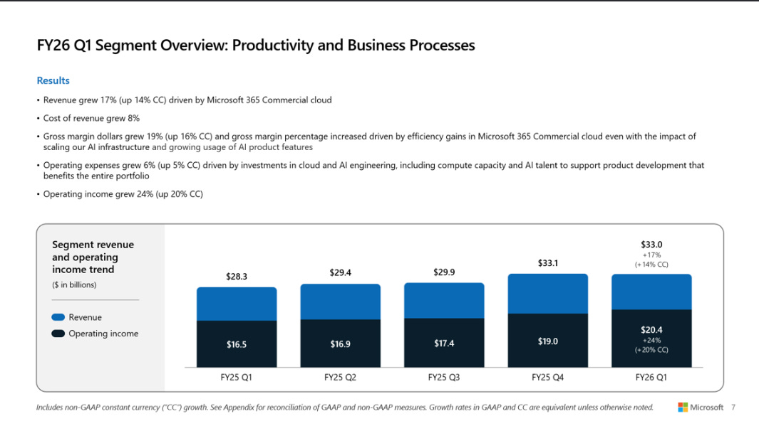 生產力與業務流程 (Productivity and Business Processes) 營收:達到 330 億美元,同比增長 17%