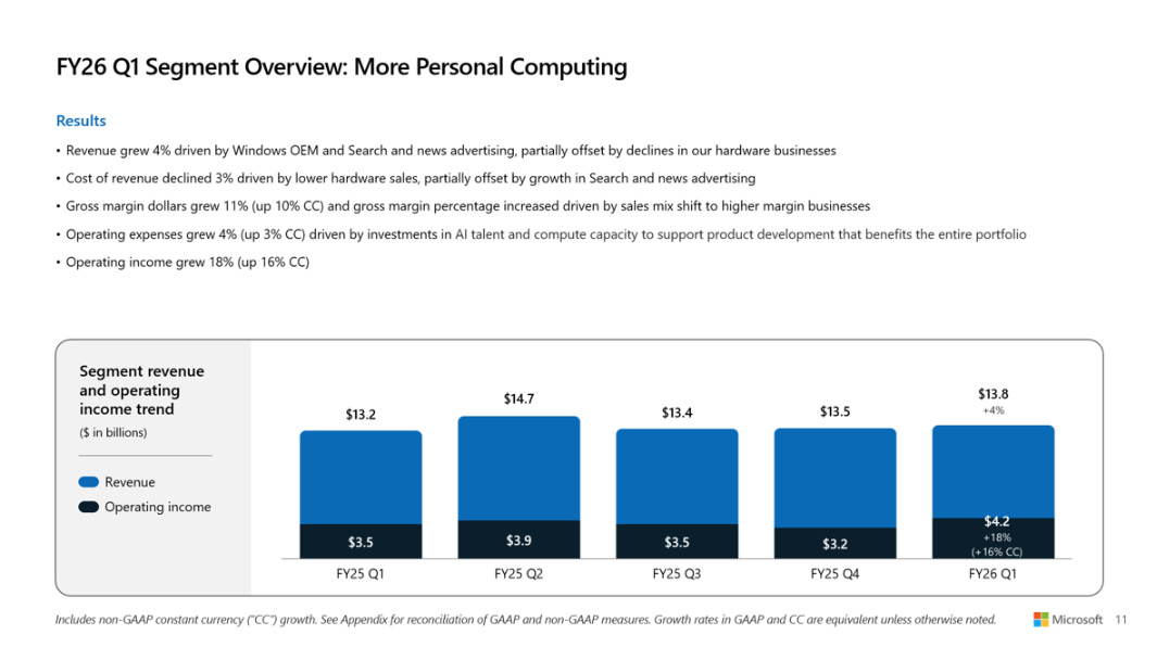 更多個人運算 (More Personal Computing) 營收:達到 138 億美元,同比增長 4%,超出市場預期的 128 億美元
