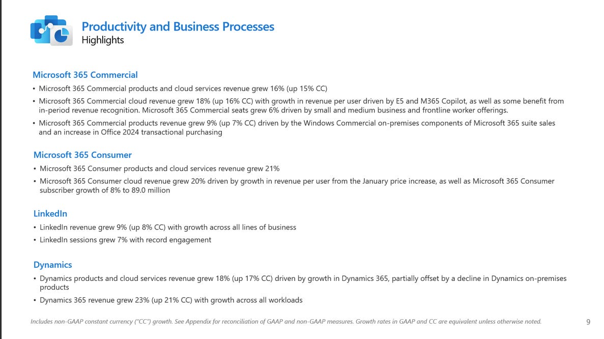 解讀: 這裡他引用了按固定匯率計算的 34% 增長(實際增長 39%),並特意點出 750 億美元的年化收入,旨在向市場展示 Azure 驚人的規模和持續的增長動能。