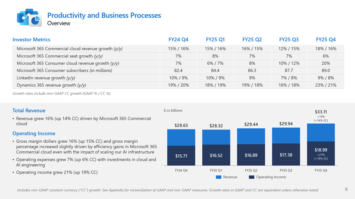 解讀: CFO 的評論聚焦於微軟雲端的整體表現,再次強化了其作為公司核心增長引擎的地位,並向投資者傳遞了財務狀況穩健、增長趨勢明確的信號。