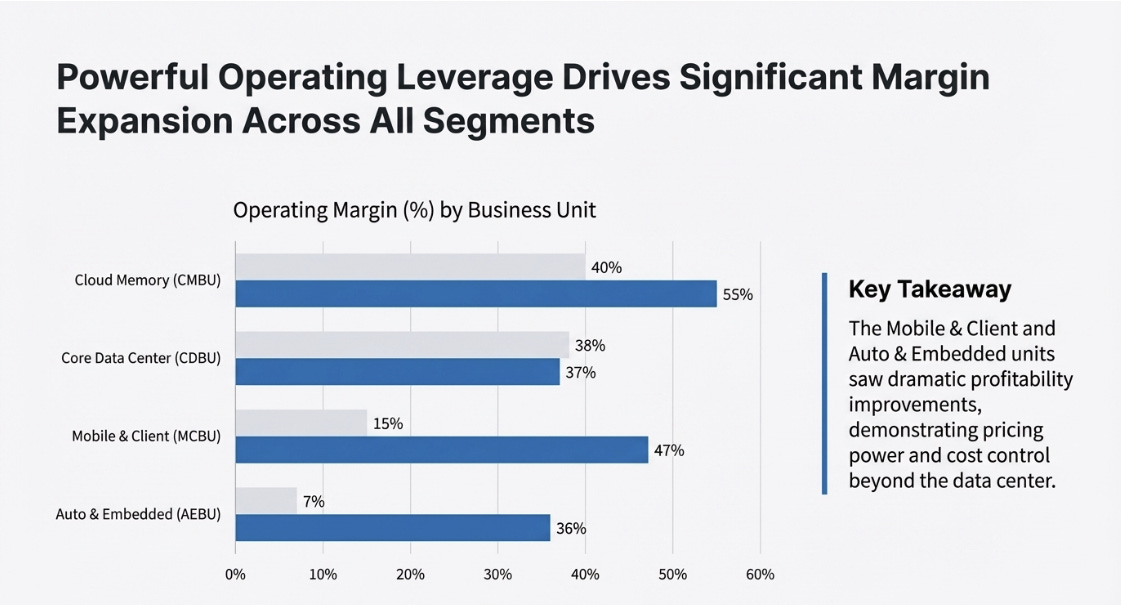 雲端記憶體(CMBU)—55% 的營運利潤率,AI 伺服器在買記憶體時,價格敏感度很低,因為缺了它整台機器就廢了。