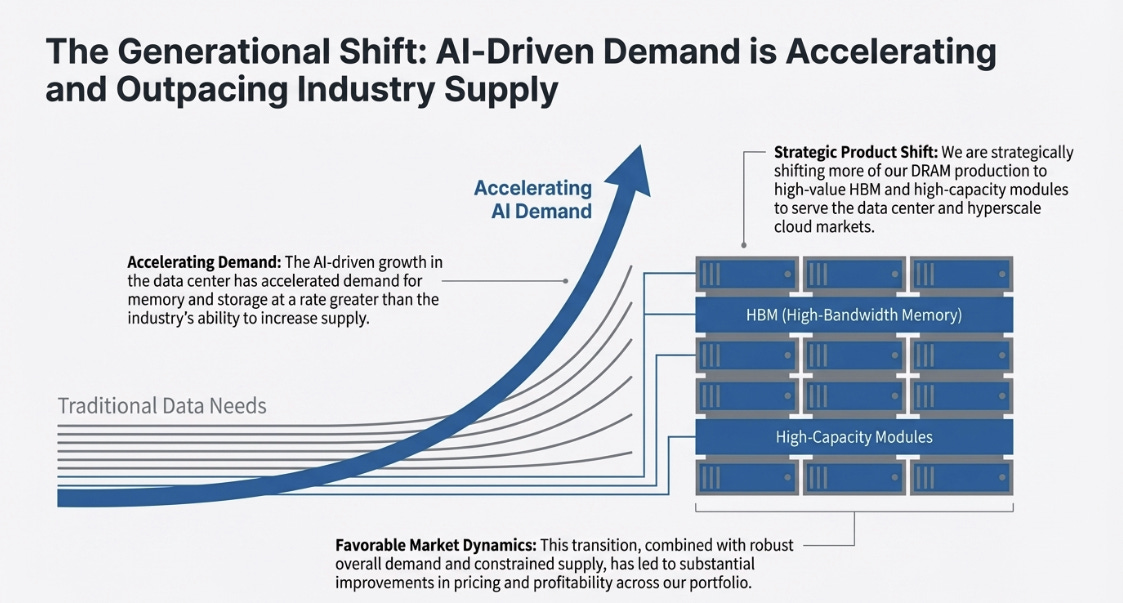 因為是「整個記憶體週期向上 + AI 拉高天花板」的組合拳。在過去,記憶體復甦 = PC 或手機拉貨,現在AI 先把價格與毛利拉上去,消費端回溫只是「再加一把油」。