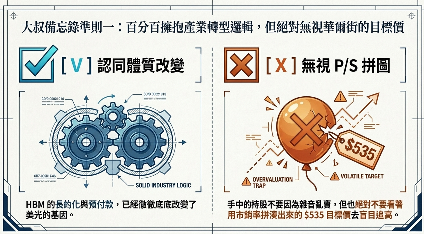 大叔百分之百認同這份報告的產業邏輯—HBM 的長約化與預付款,改變美光的體質。我們手上的 MU 0.00%↑ 請記住不要追高,但也不要亂賣。請直接無視用 P/S 拼湊出來的 $535 目標價。