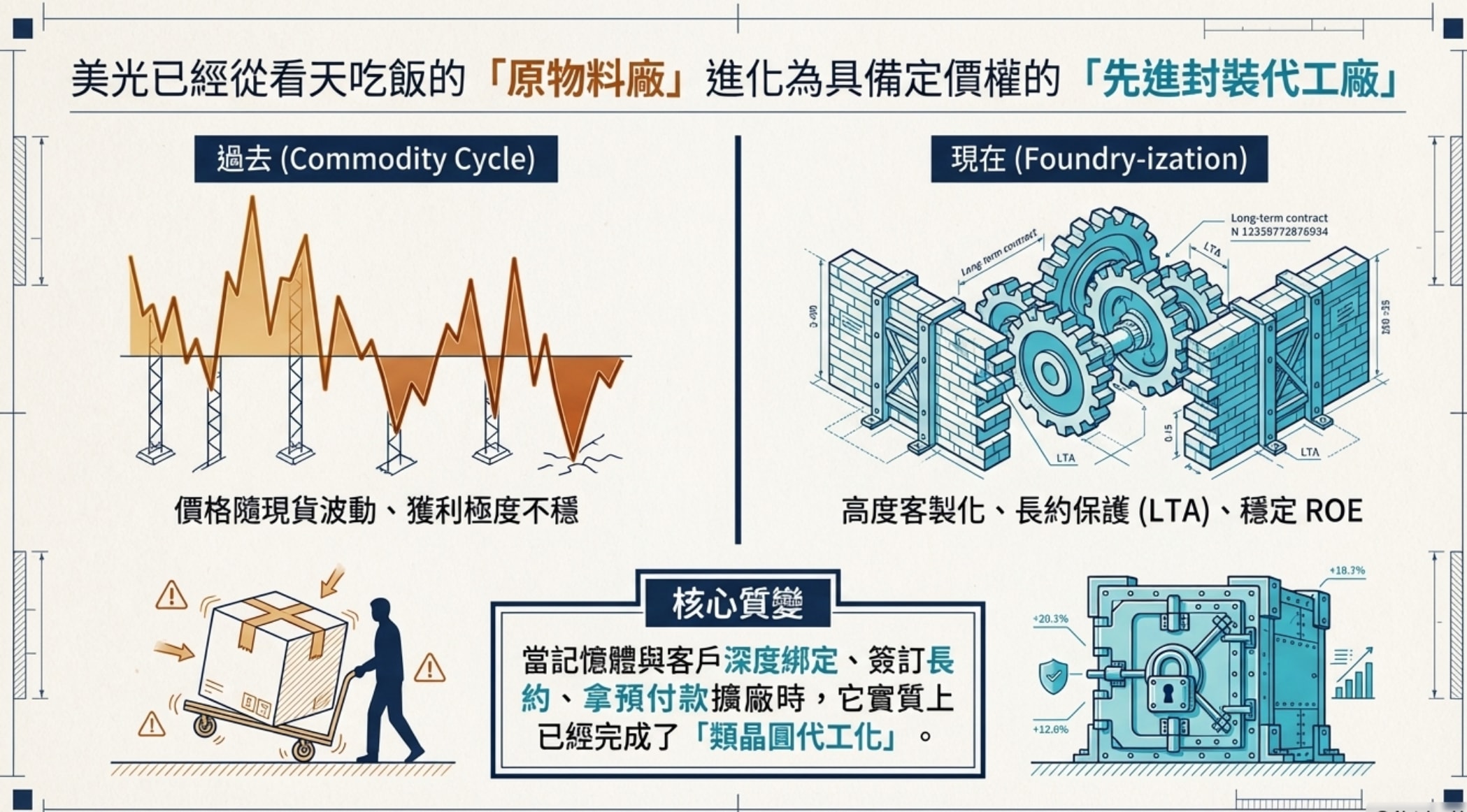 瑞銀提到,美光為確保長期穩定的 ROE,願意犧牲一點短期的極端現貨漲幅,來簽訂長約(具有價格區間保護)。當記憶體開始與客戶深度綁定、簽訂長約、拿預付款擴廠時,再也不是那個看天吃飯的大宗原物料,而是具備高度客製化與定價權的先進封裝代工廠。