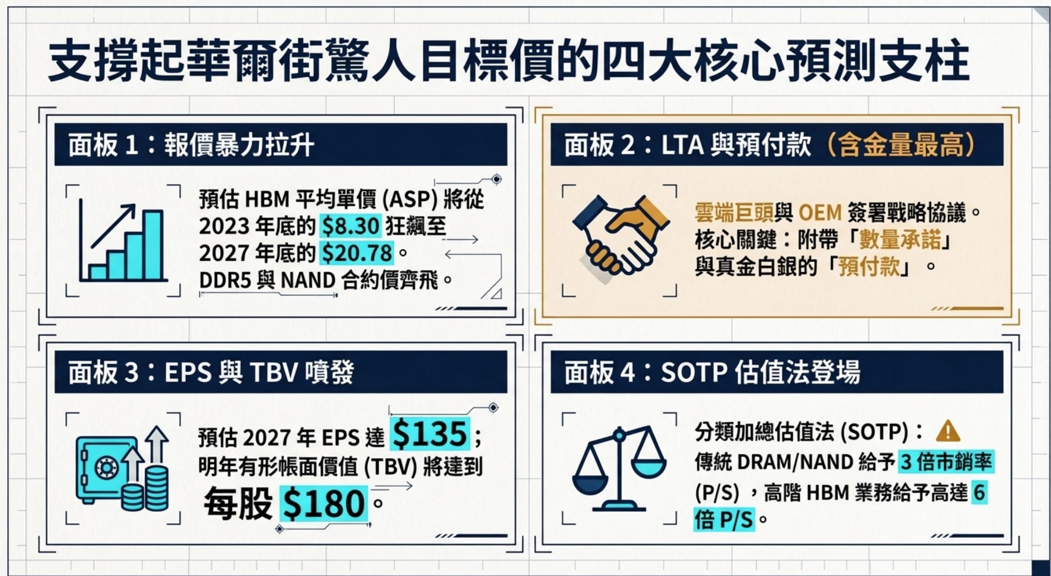 為了給出 $535 的目標價,瑞銀使用了「分類加總估值法」。他們將美光拆成兩半:傳統 DRAM+NAND 業務給予 3倍 P/S(市銷率),而高階的 HBM 業務則給予高達 6倍 P/S。
