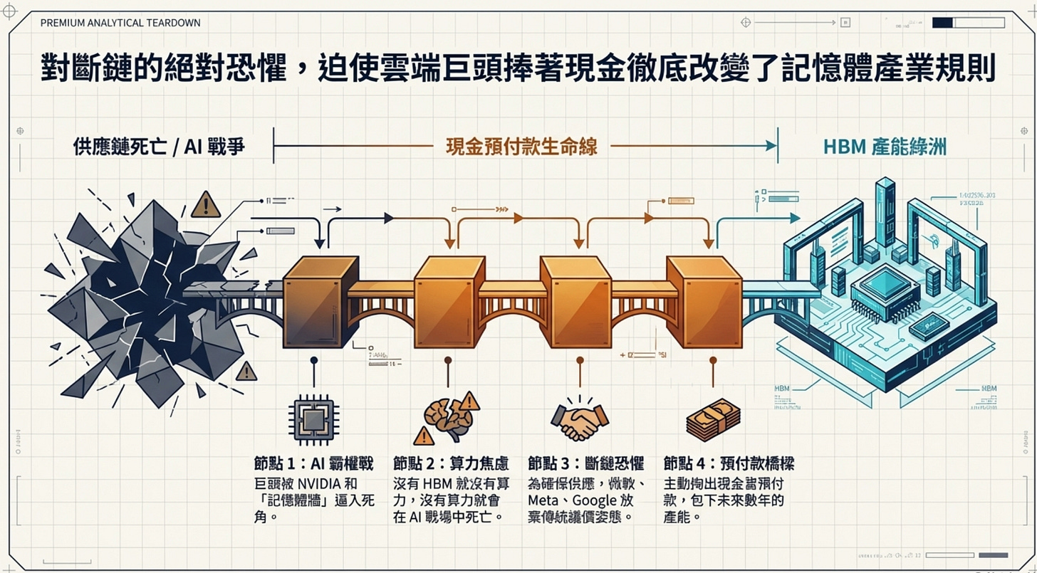 在傳統的記憶體週期裡,都是記憶體廠求著 PC 或手機廠買貨。但現在情況完全反轉。微軟、Meta、Google 為願意掏出白花花的現金當預付款,因為在 AI 時代「沒有 HBM 就沒有算力,沒有算力就會在 AI 霸權戰中死亡」。雲端巨頭被 NVIDIA 和記憶體牆逼到了牆角,他們對斷鏈的恐懼。