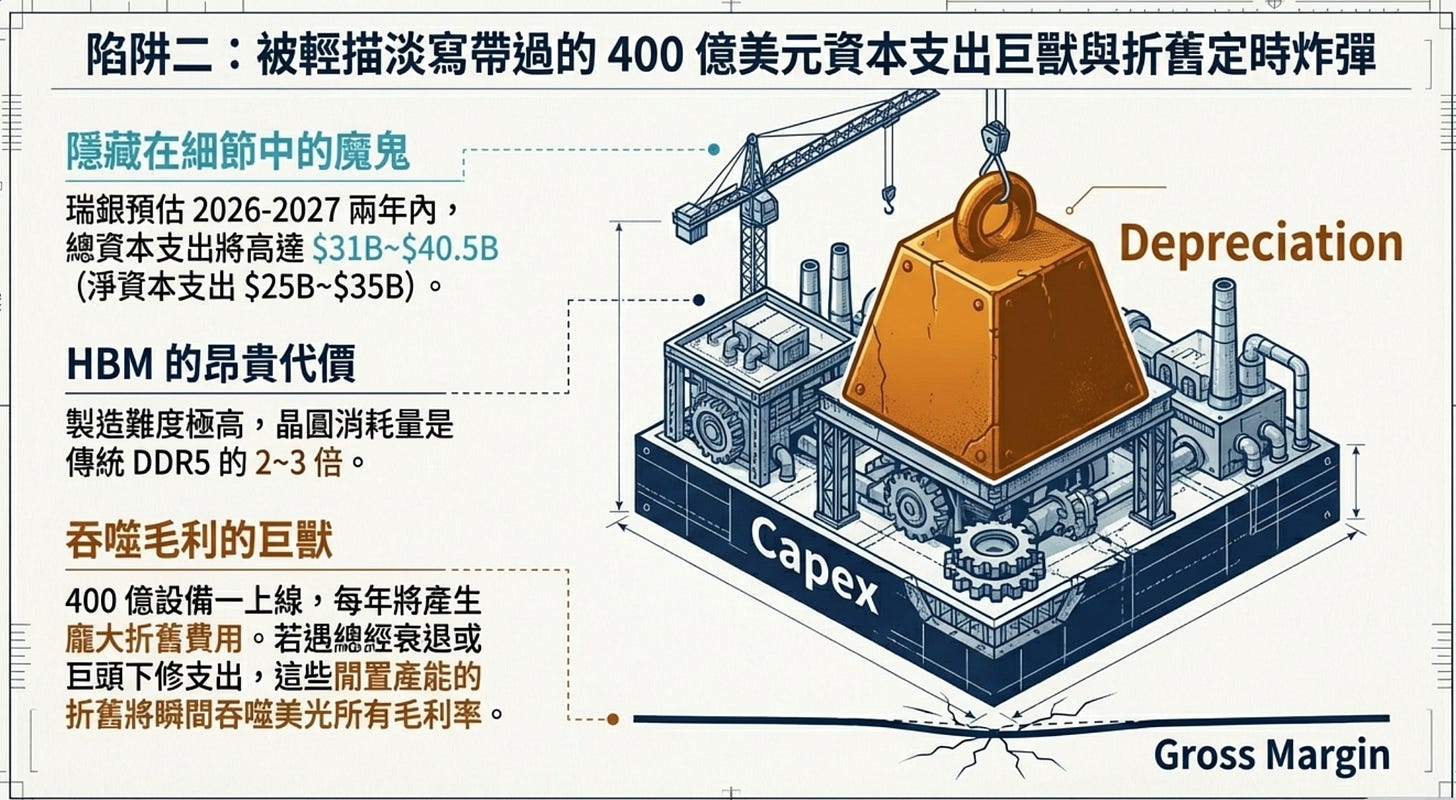 投行只告訴你未來會賺很多錢,但沒告訴你,這 400 億美元的設備一旦上線,每年將產生許多折舊費用。如果 2027 年底 AI 伺服器需求如預期般高歌猛進,那沒問題;但萬一遇到總經衰退、巨頭下修資本支出,這些閒置產能與折舊,將會瞬間吞噬掉美光所有的毛利率。