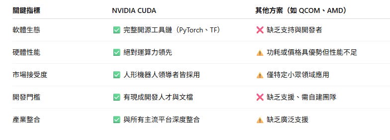 開發者社群、工具鏈(如 PyTorch/TensorFlow)全部圍繞 CUDA 架構而生。