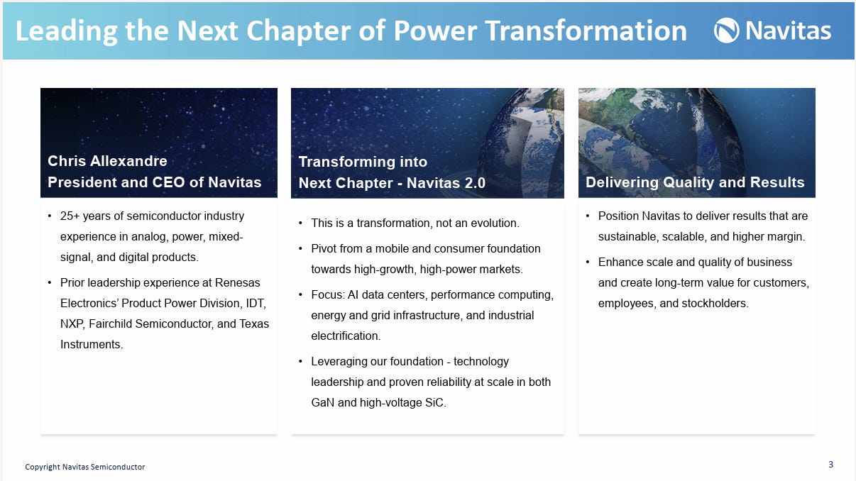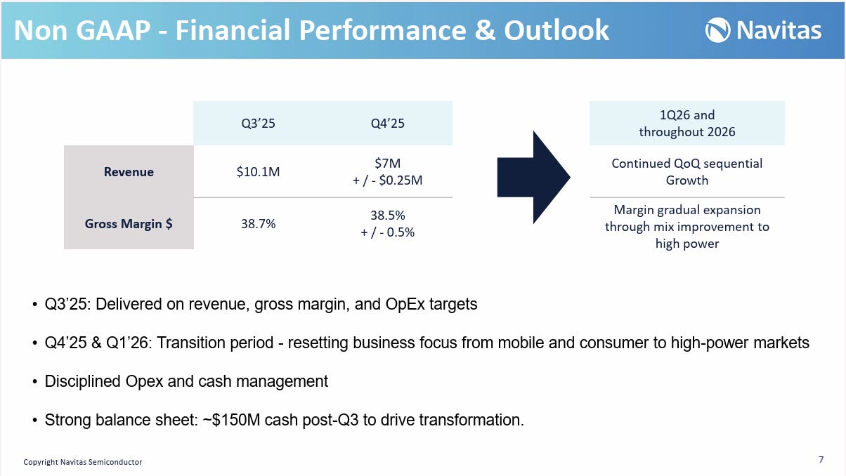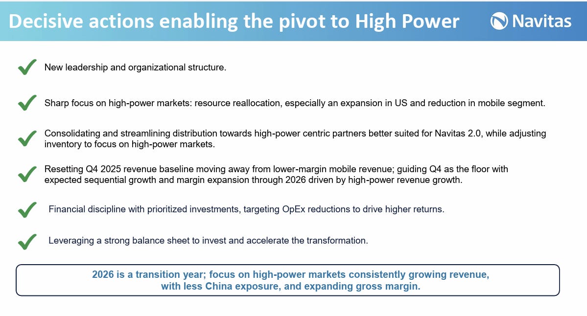 Q3 收入 $22M,Q4 指引更低 → 看起來在走下坡路,這是 Navitas 1.0(手機/消費晶片) 自行終結的結果