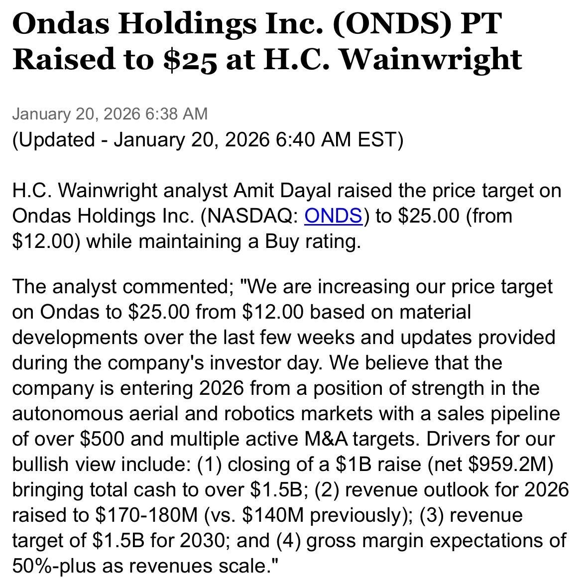【大叔週報】H.C. Wainwright 將ONDS 目標價喊到 $25解讀 H.C. Wainwright 的邏輯大叔美股筆記 Uncle Stock NotesJan 21, 2026∙ Paid407327Share大叔幫你把這份報告裡「沒寫在標題、但寫在行間」的四個超級利多 拆給你看,也再次驗證我們前面一路推演的邏輯,一個都沒錯。目標價直接翻倍:從 $12 → $25分析師 Amit Dayal 將目標價從 $12.00 一口氣拉到 $25.00(+108%),華爾街分析師最怕被打臉,通常是「慢慢調、邊走邊看」。現在等於在說:「對不起,我之前完全低估這家公司了。」Continue reading this post for free, courtesy of 大叔美股筆記 Uncle Stock Notes.Claim my free postOr purchase a paid subscription.