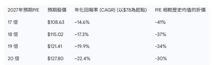 遠期本益比 (NTM P/E): 目前約 14.9 倍 的遠期本益比,不僅遠低於其 28.63 倍 的歷史平均,甚至低於市場平均水平。這意味著市場對其未來的預期極其悲觀。