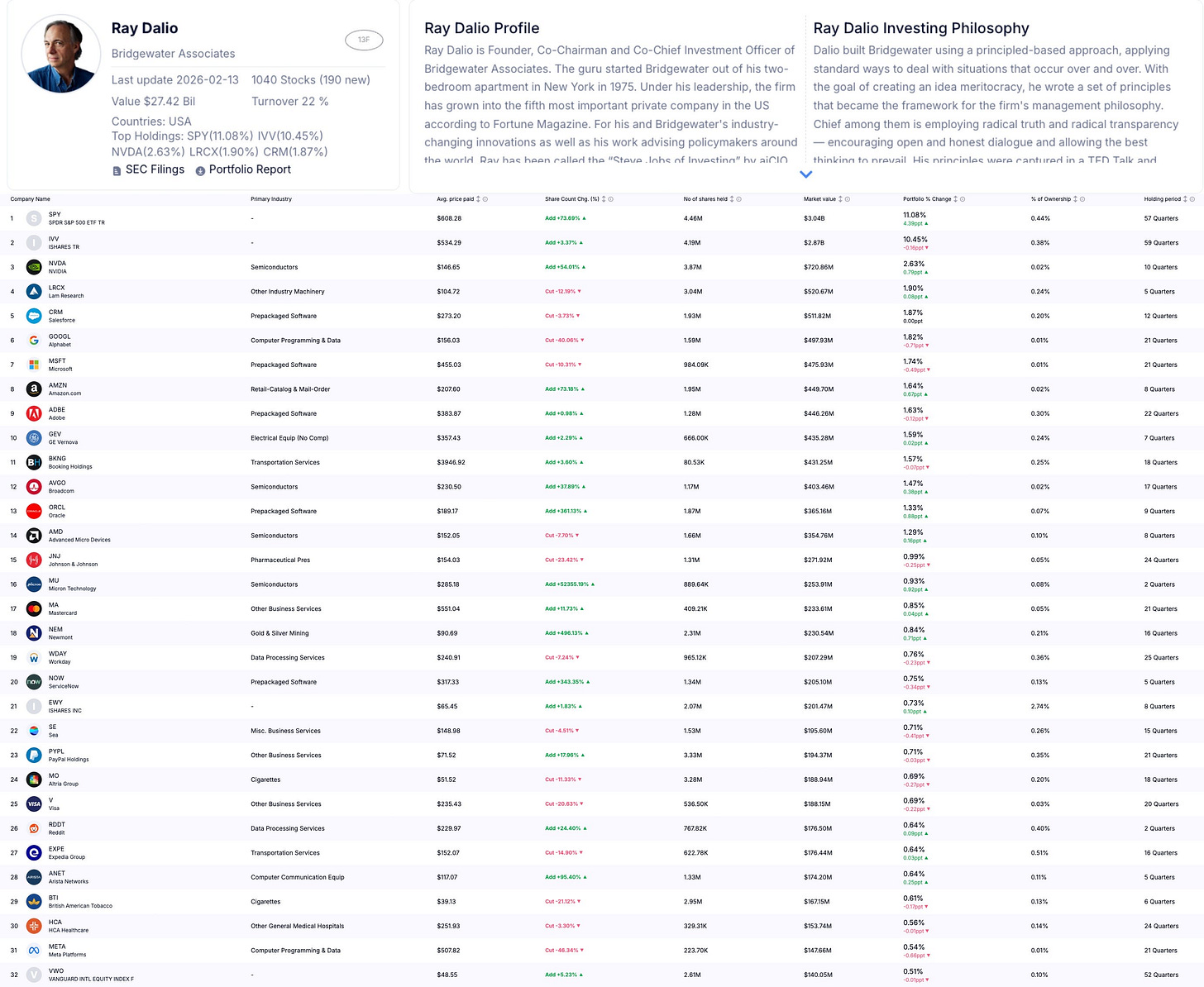 最大的買進動作是 #SPY (+73%),直接把大盤 ETF 買成最大持倉。但同時,第 18 名的全球最大金礦商 Newmont #NEM 被大幅加碼了 +496%。Ray Dalio 是總經大師,他加碼大盤代表他看好美國經濟的韌性與 AI 帶動的生產力提升。