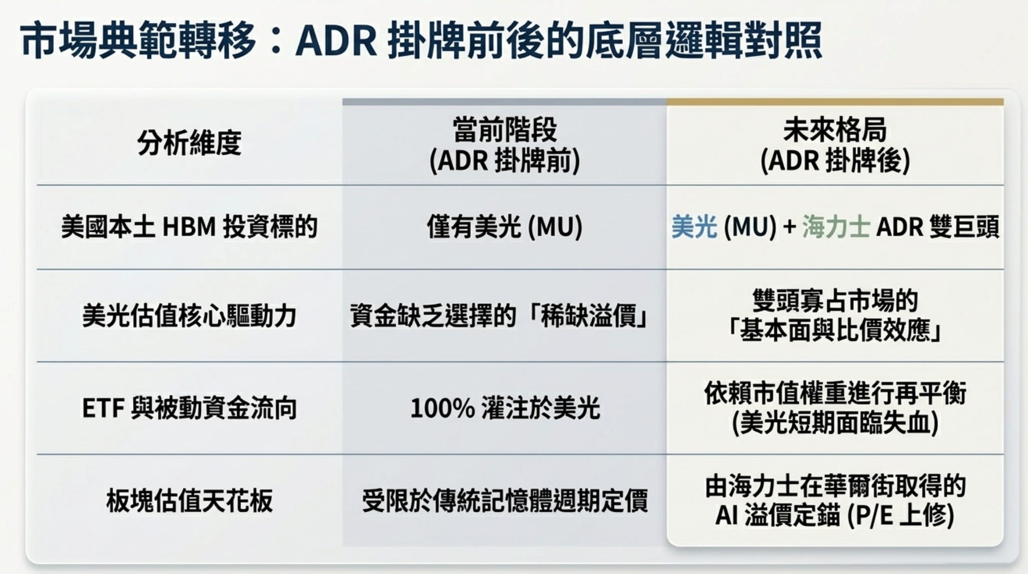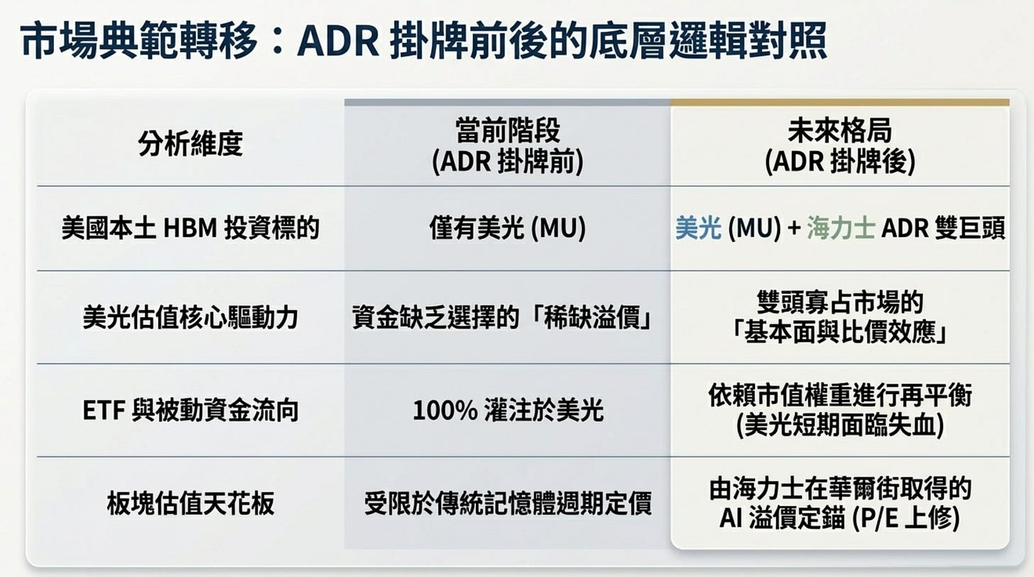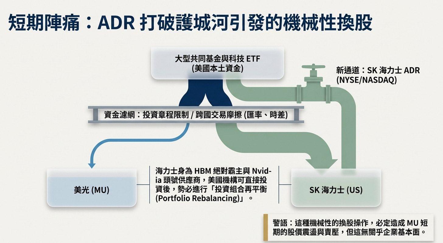 這道資金護城河就會被打破。海力士是目前 HBM 的絕對霸主(市佔率最高、Nvidia 的頭號供應商)。一旦美國本土機構可以直接透過買賣 ADR 來投資海力士,他們一定會進行「投資組合再平衡」。他們會賣出一部份的 MU,轉而建立海力士的部位。這種機械性的換股操作會對 MU 造成短期的股價震盪與賣壓。