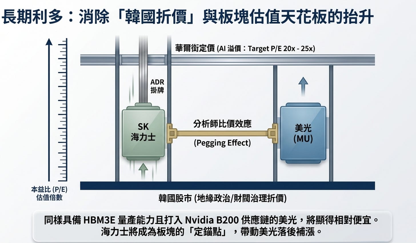 如果你熬過了短期的資金排擠,接下來發生的事對美光反而是好事。韓國股市長期存在所謂的「韓國折價(Korea Discount)」(因為地緣政治、財閥治理等因素,韓國公司的本益比通常比美國同業低很多)。目前海力士雖然技術領先,但它的本益比(P/E)或股價淨值比(P/B)其實相對委屈。