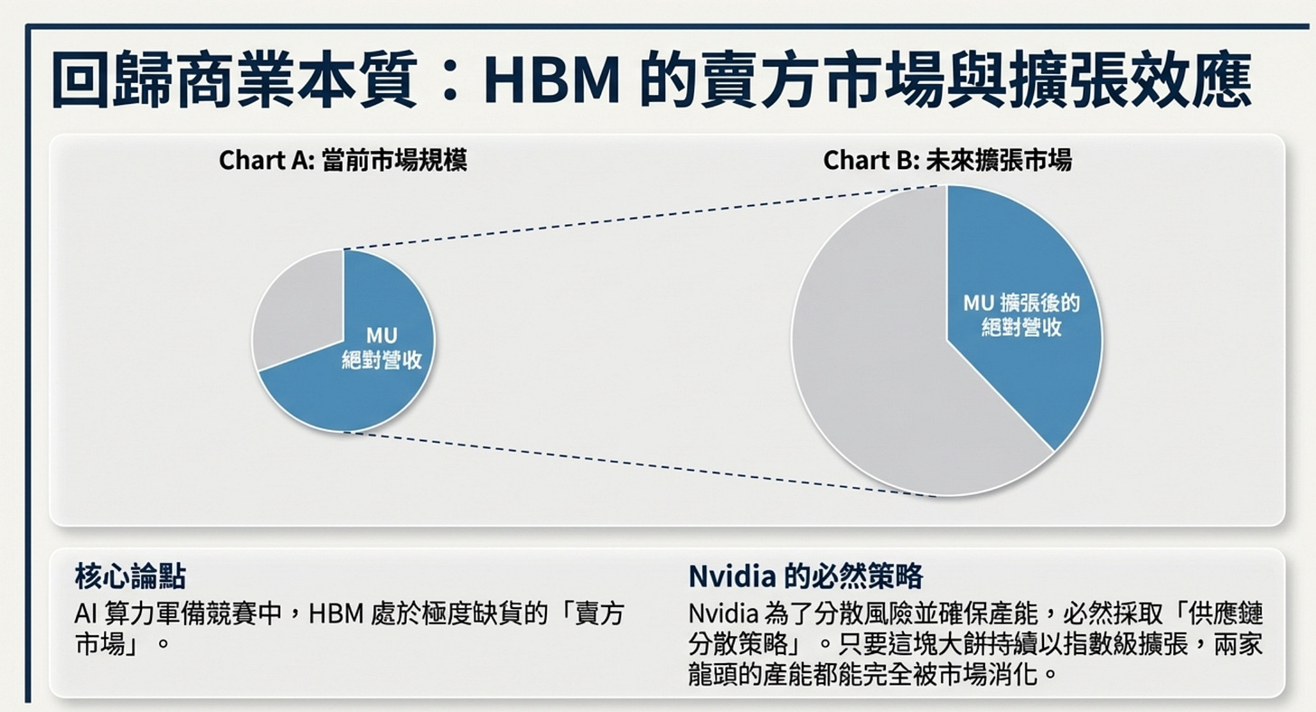 AI 算力的軍備競賽中,HBM 是極度缺貨的「賣方市場」。Nvidia 為了分散風險、確保產能,絕對不可能只跟海力士買,它必須分散分險。只要這塊餅還在變大,兩家龍頭絕對都能吃到流油。