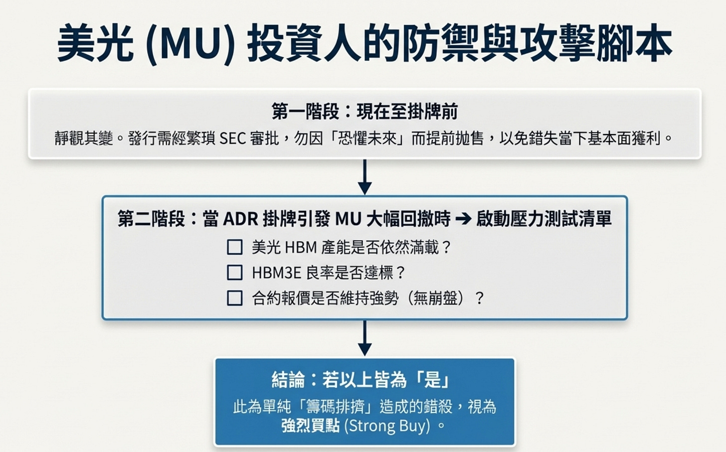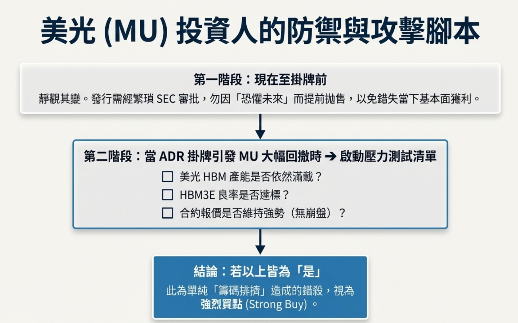如果未來海力士真的敲鐘掛牌 ADR,那幾天 MU 大機率會因為資金抽離而下跌。但只要確定美光當時的 HBM 產能依然滿載、良率達標、合約報價沒有崩盤,這種單純因為「籌碼排擠」造成的下跌,這也許是「錯殺後的買點」。