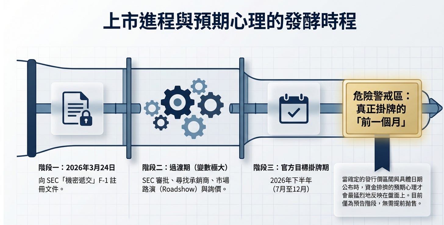 為何還沒有確切日期? 因為赴美上市需要經過 SEC 的嚴格審查,加上後續還要找承銷商進行市場路演(Roadshow)與詢價。這整個流程充滿變數,所以公司通常不會在這個階段就把具體是幾月幾號定死,會視當時的「市場胃口」與「總經環境」來挑選黃金吉日。