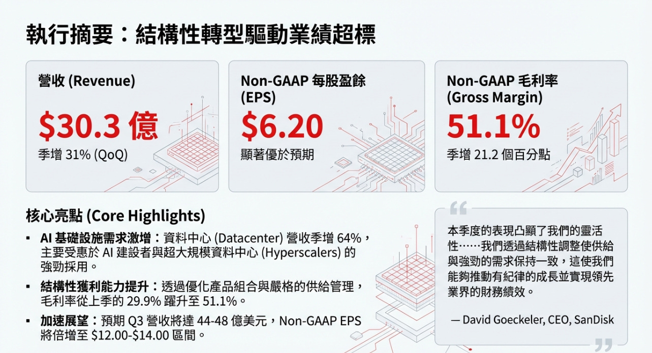 SanDisk這家從 Western Digital 分拆後、專注快閃記憶體的公司交出了一張完全不像 NAND 公司的成績單。如果你覺得Q2 營收年增 61%跟EPS 年增 404%已經夠瘋狂了,