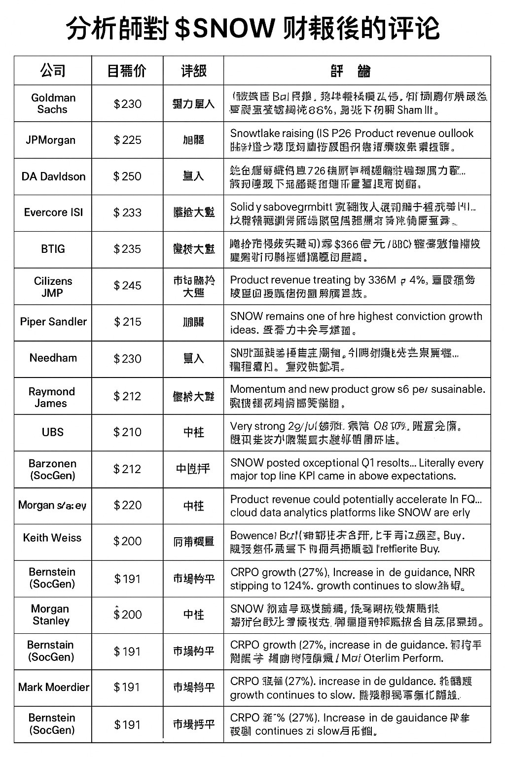 「SNOW 公布卓越的第一季業績…… 所有主要營收關鍵指標皆優於預期…… 第二季產品營收可能進一步加速…… 雲端數據分析平台如 SNOW 是 AI 受益的早期贏家…… 我們將目標價上調至235美元,重申買入評級。」