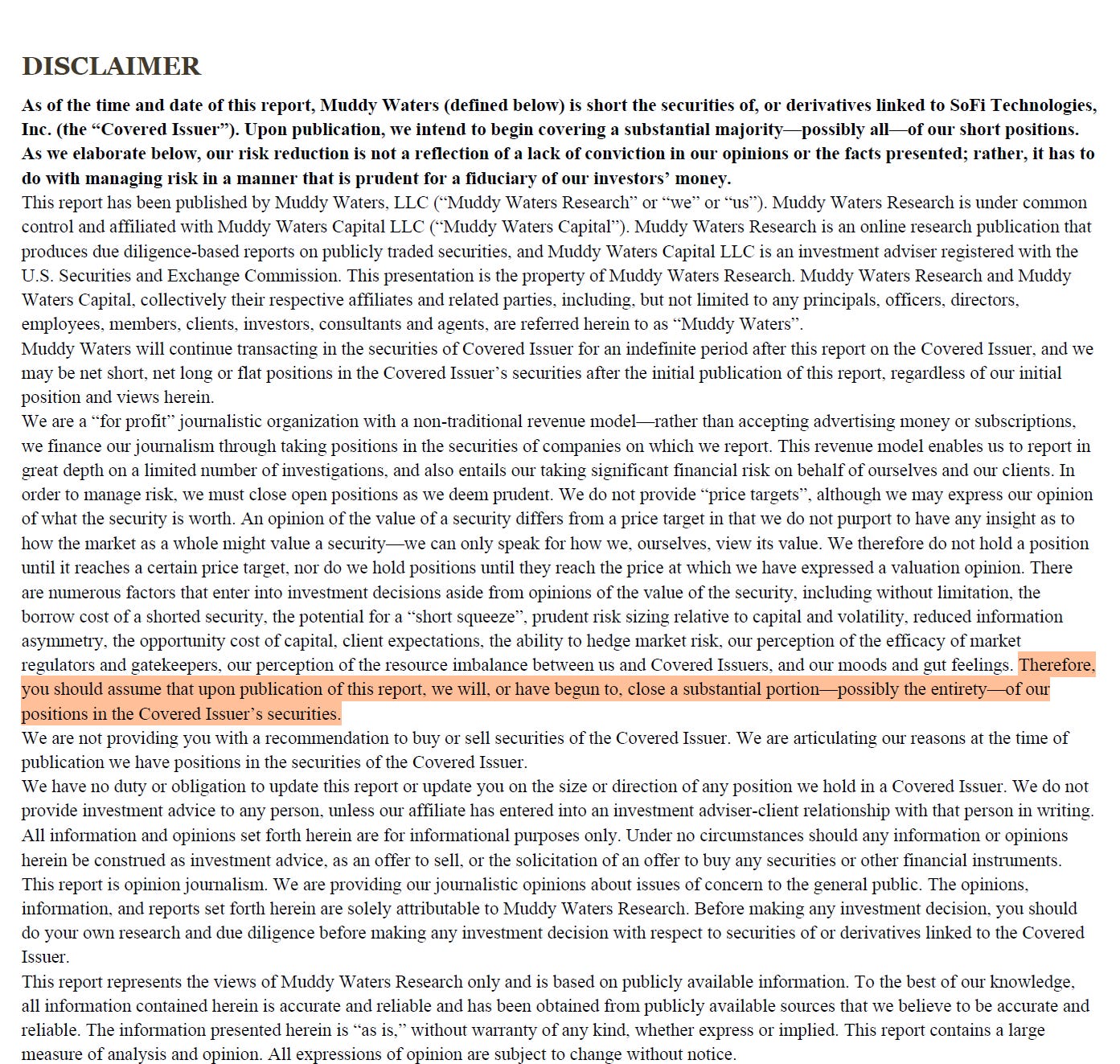 中文翻譯: 因此您應該假設在報告發布之時,我們將會、或已經開始平倉(平掉)我們在該發行公司證券中的絕大部分—甚至可能是全部的—部位。