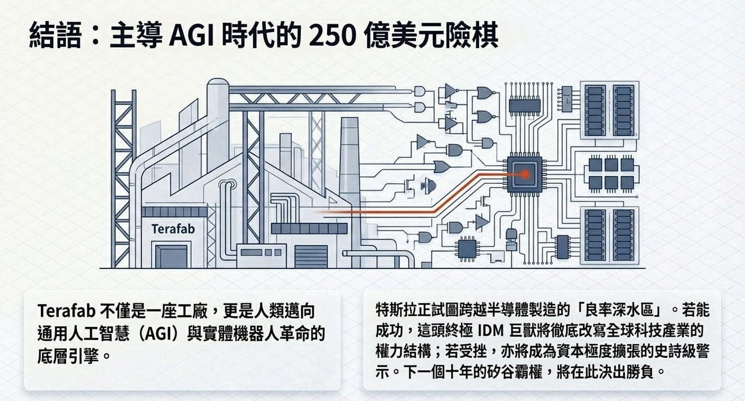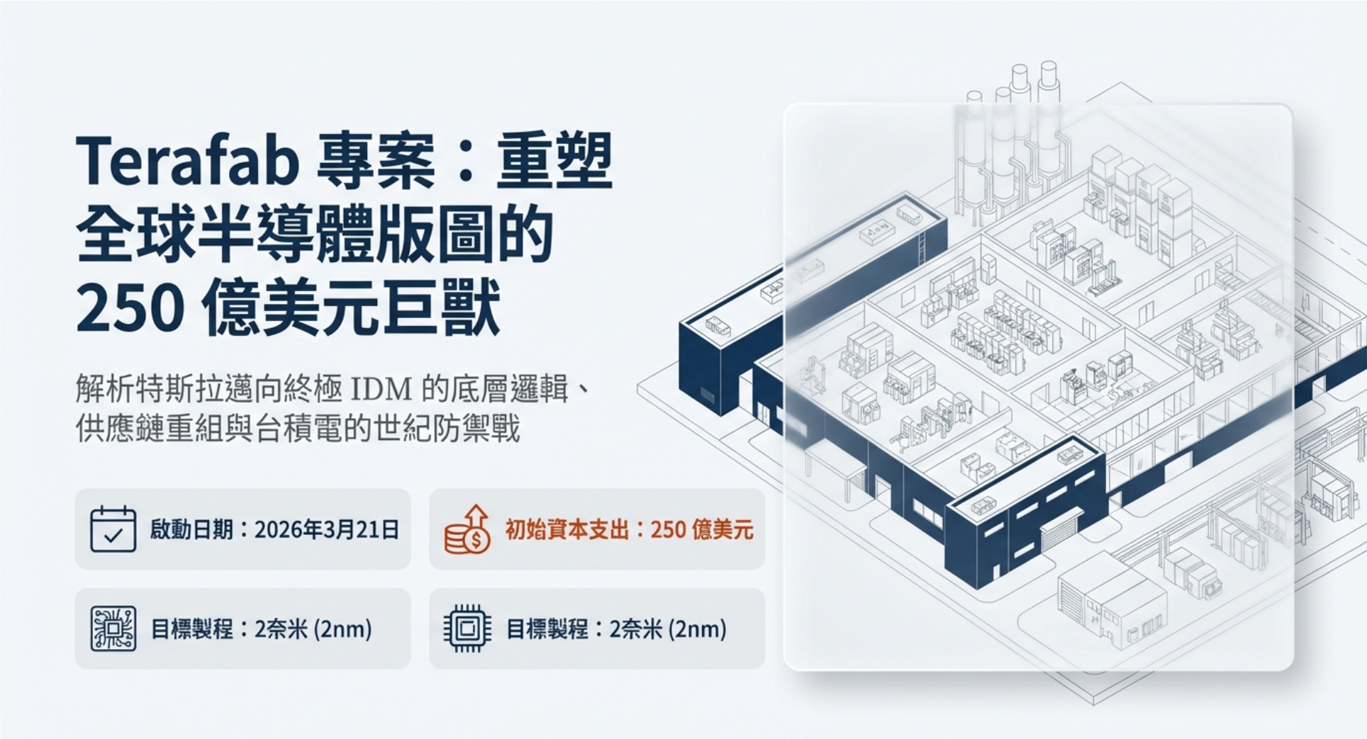 特斯拉「Terafab」專案的正式啟動,是馬斯克想主導下一個十年的通用人工智慧(AGI)與實體機器人革命,自己所佈下的險棋。透過初期投資250億美元建立整合邏輯、記憶體與先進封裝的2奈米晶圓廠,特斯拉想改變為垂直整合的IDM巨獸。