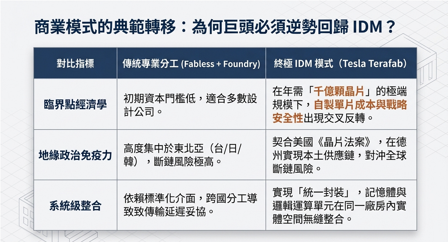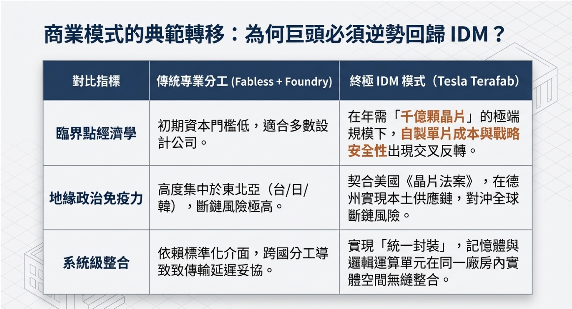 Terafab的出現也許會逆轉這個趨勢,當資本規模大到某個臨界點(如每年需千億顆晶片)時,專業分工回歸到IDM模式(自行設計與製造)將有更高的經濟效益與戰略安全性。如果特斯拉的模式取得成功,可能讓蘋果、谷歌或Meta等擁有高算力需求的科技巨頭評估自身的半導體製造戰略,也許會尋求更高程度的製造控制權。這對純晶圓代工業者構成威脅。
