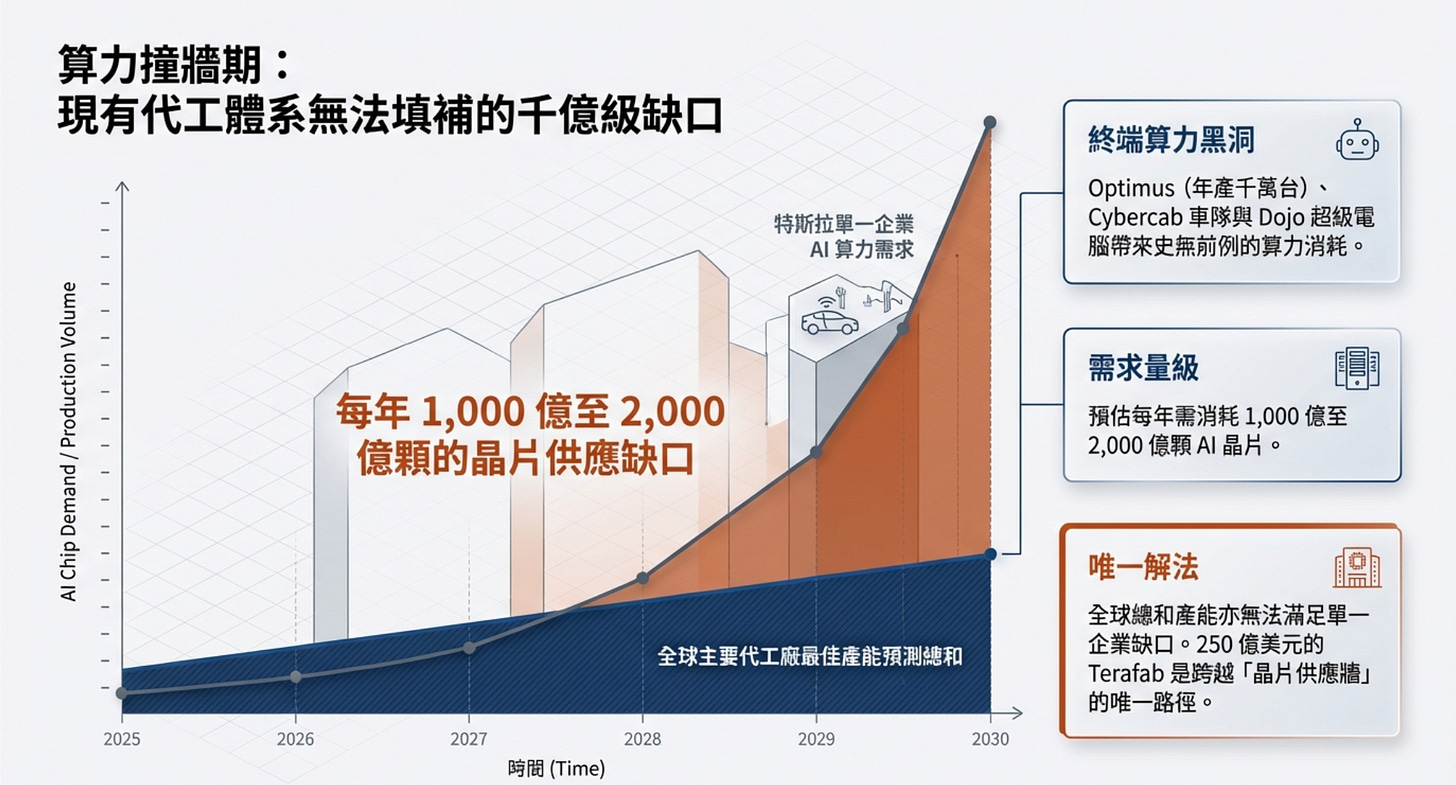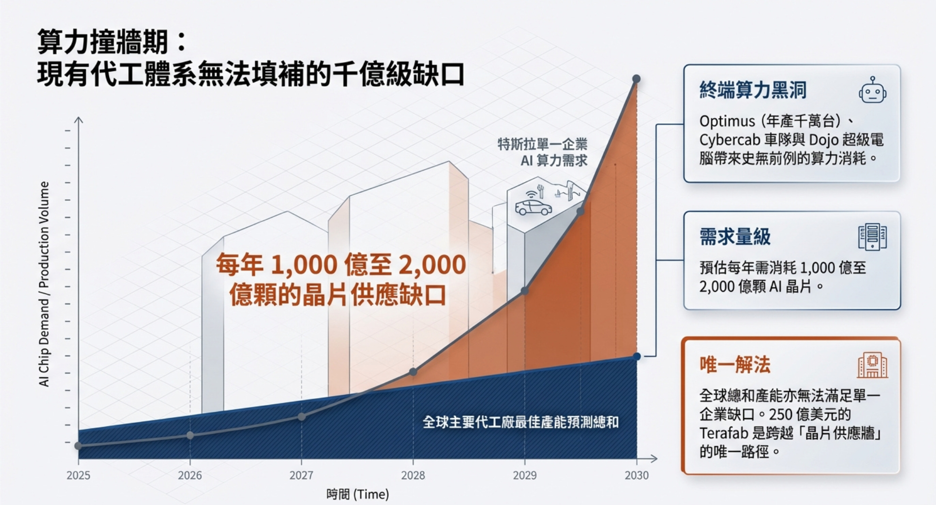 Elon Musk 在 2026 年初的財報電話會議就有提到,即便將全球主要晶圓代工廠的最佳產能預測相加,仍無法支持特斯拉未來的需求缺口,未來將面臨一座「晶片供應牆」(Chip Wall)。Terafab 專案其實是為了解決這瓶頸:透過建設年產約一千億至兩千億顆 AI 晶片的超大晶圓廠,想要從目前的窘境,改變算力基礎設施的生產與供應邏輯。