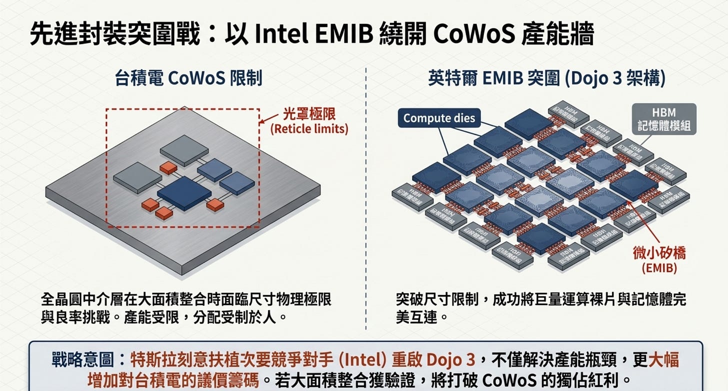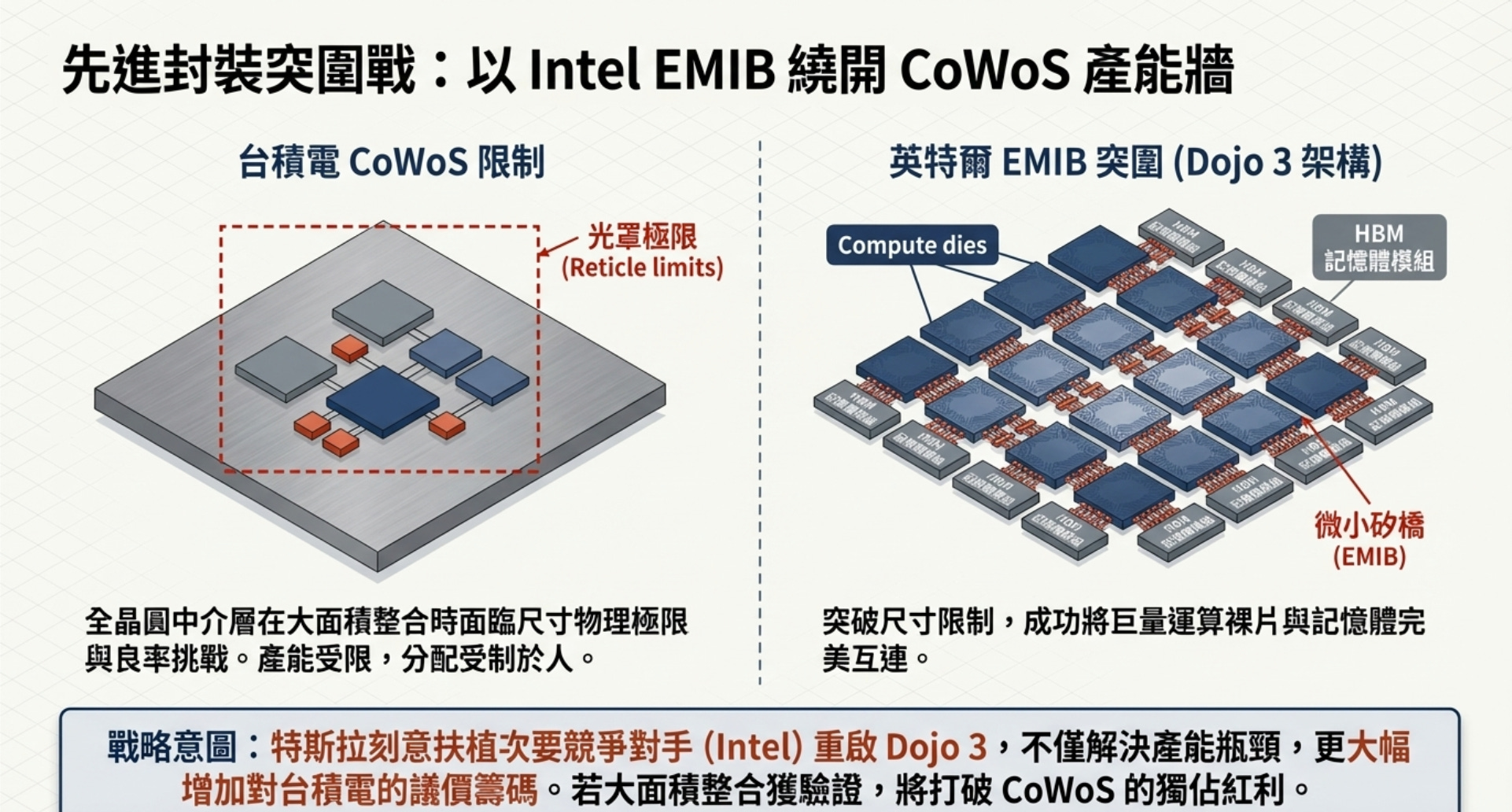 台積電的CoWoS封裝技術是目前Nvidia等AI巨頭的唯一選擇,台積電也計畫在2026年底前將CoWoS產能大幅擴充約80%至每月12萬片。特斯拉在重啟Dojo 3超級電腦專案時,將運算晶片(D3)交由三星位於德州的2奈米製程生產,而將關鍵的組裝與測試作業交由英特爾的EMIB技術處理。這種「繞開台積電」的供應鏈策略,特斯拉為了突破產能瓶頸並增加議價能力,正在積極扶植台積電的競爭對手。若英特爾的EMIB在Dojo 3專案上證明大面積整合上的優越性與良率,可能引發其他面臨CoWoS產能分配限制的AI晶片設計公司效仿,這將衝擊台積電在先進封裝市場的獨佔紅利(重點是良率)。