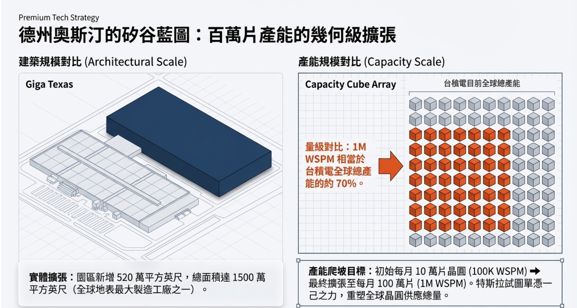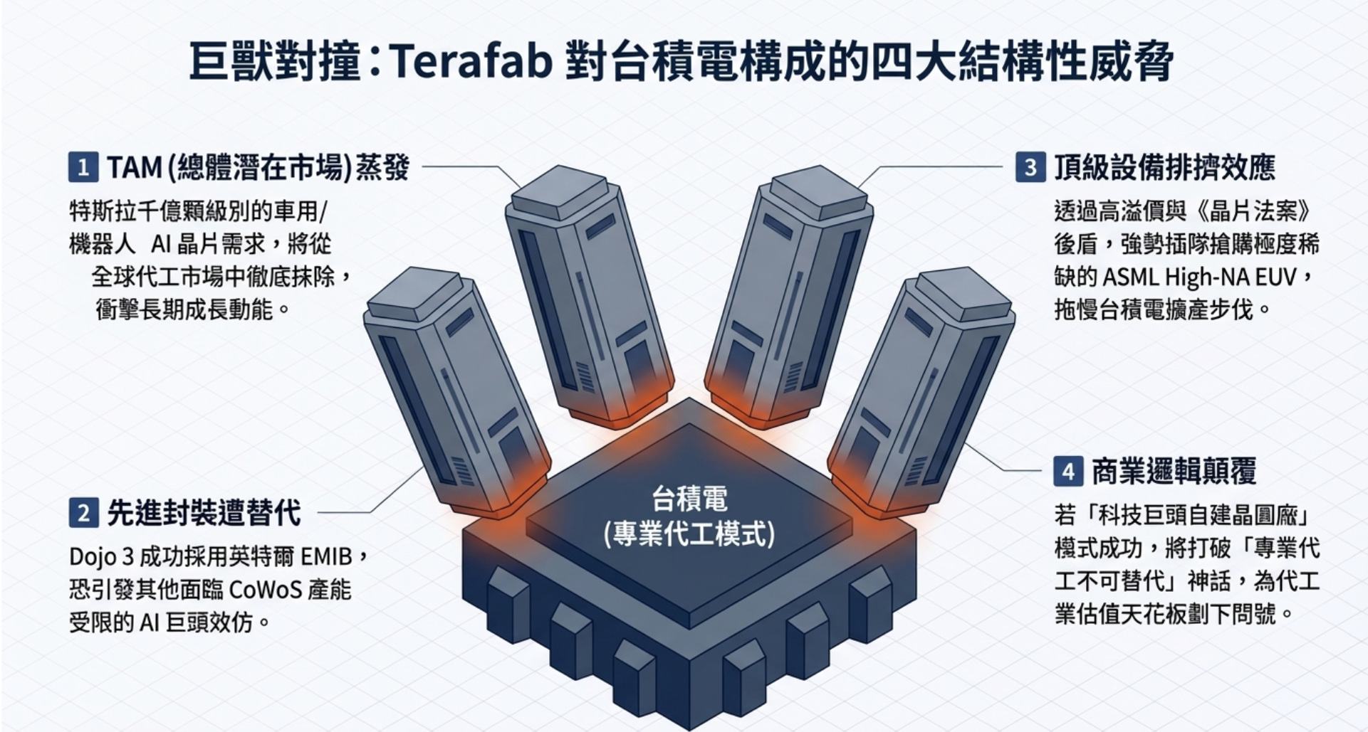 如果特斯拉證明科技巨頭能夠透過自建超大型晶圓廠(Terafab),以「晶圓級隔離」等降低成本,消除中間商的利潤,同時擁有更優的硬軟體整合與地緣政治免疫力,這將對台積電的估值造成打擊。蘋果或谷歌也會思考特斯拉可以,為何我們不仿效,這實質上為晶圓代工業的長期天花板劃上巨大的問號。