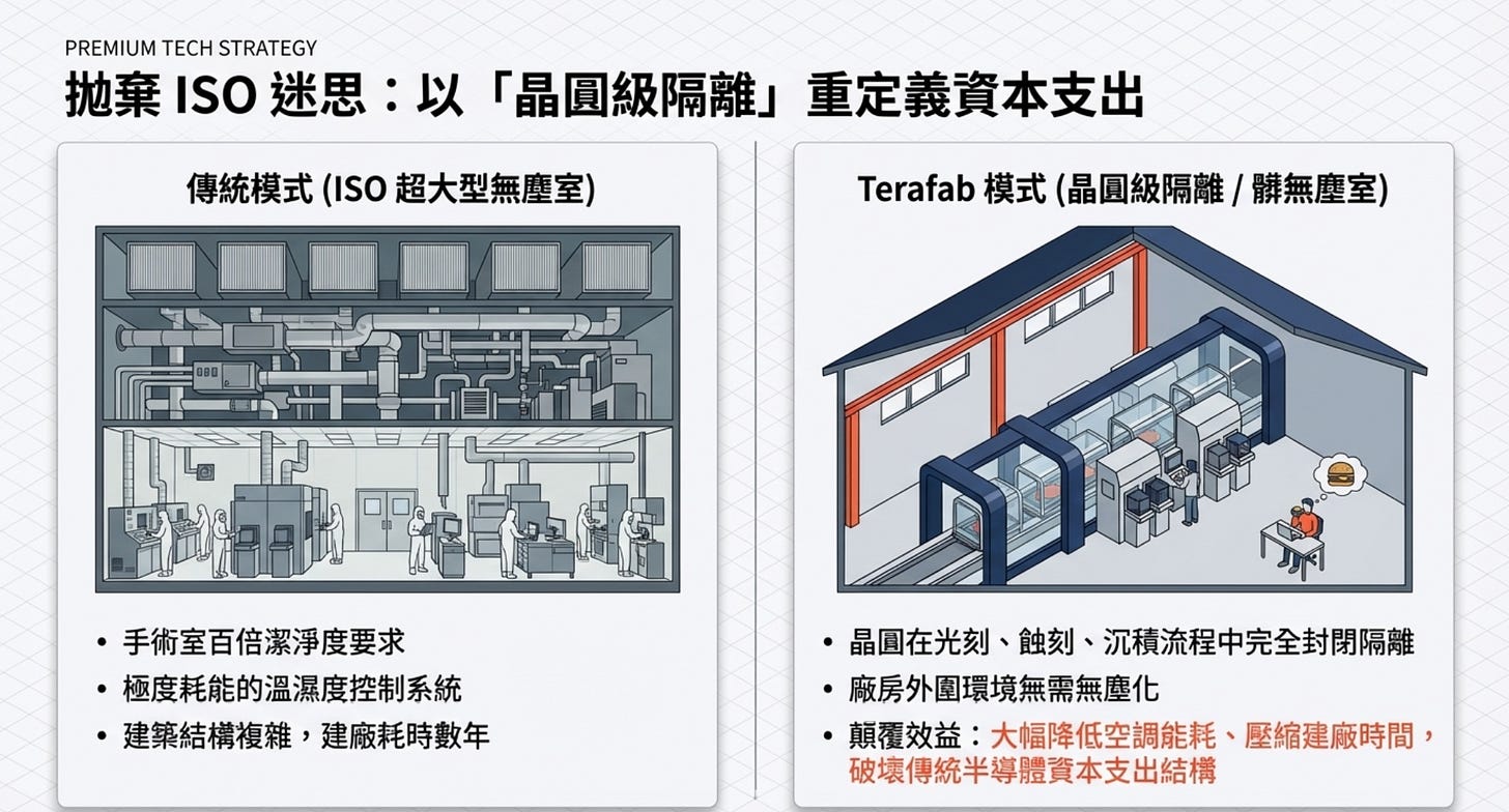 然而,馬斯克提出了質疑,並計畫在Terafab推行被業界稱為「晶圓級隔離」(Wafer-level isolation)或「髒無塵室」(Dirty cleanroom)的概念。這種設計主動放棄維持整棟建築的超高潔淨度,轉而將矽晶圓在整個光刻、蝕刻、沉積等製造流程中完全封閉隔離,讓整個製造環境與周圍的廠房環境隔絕。馬斯克開玩笑說這種設計可以讓工程師未來在晶片製造的同時「在無塵室裡吃起司漢堡」,以後特斯拉晶片可能有起司漢堡口味。當然如果能透過創新的傳輸模組與環境控制成功克服良率挑戰,這絕對能大幅降低建廠成本與空調能耗,大幅縮短建廠時間,甚至重新定義半導體資本支出結構。