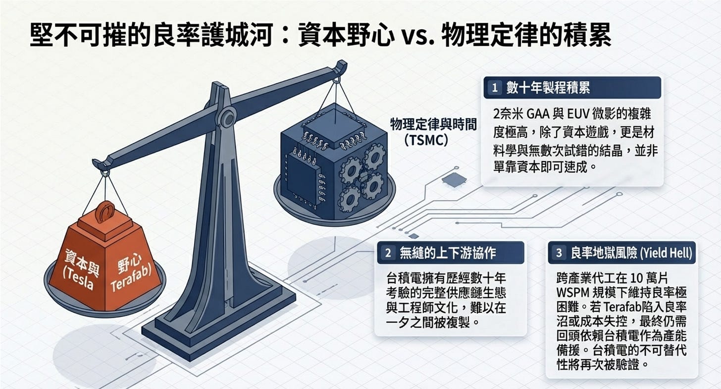 在歷史上不乏企圖彎道超車卻深陷泥沼的案例,特斯拉能否在缺乏這些經驗累積情況下,短期內灣道超車成功駕馭2奈米GAA製程、克服極紫外光微影的複雜,並將「晶圓級隔離」從概念轉化成高良率的實踐,這將會是一個巨大的未知數。另外蓋一個類似這樣規模的廠,至少要兩年的時間,在工廠準備好之前,也許晶圓代工又到了下一個等級,而Terafab慘遭「良率地獄」或成本嚴重失控,最終可能還是必須大幅依賴台積電作為主要的產能備援,屆時台積電的不可替代性反而又再次被確認。我還是一句話,相信台積電的護城河,相信台積電建立了數十年的完整供應鏈。