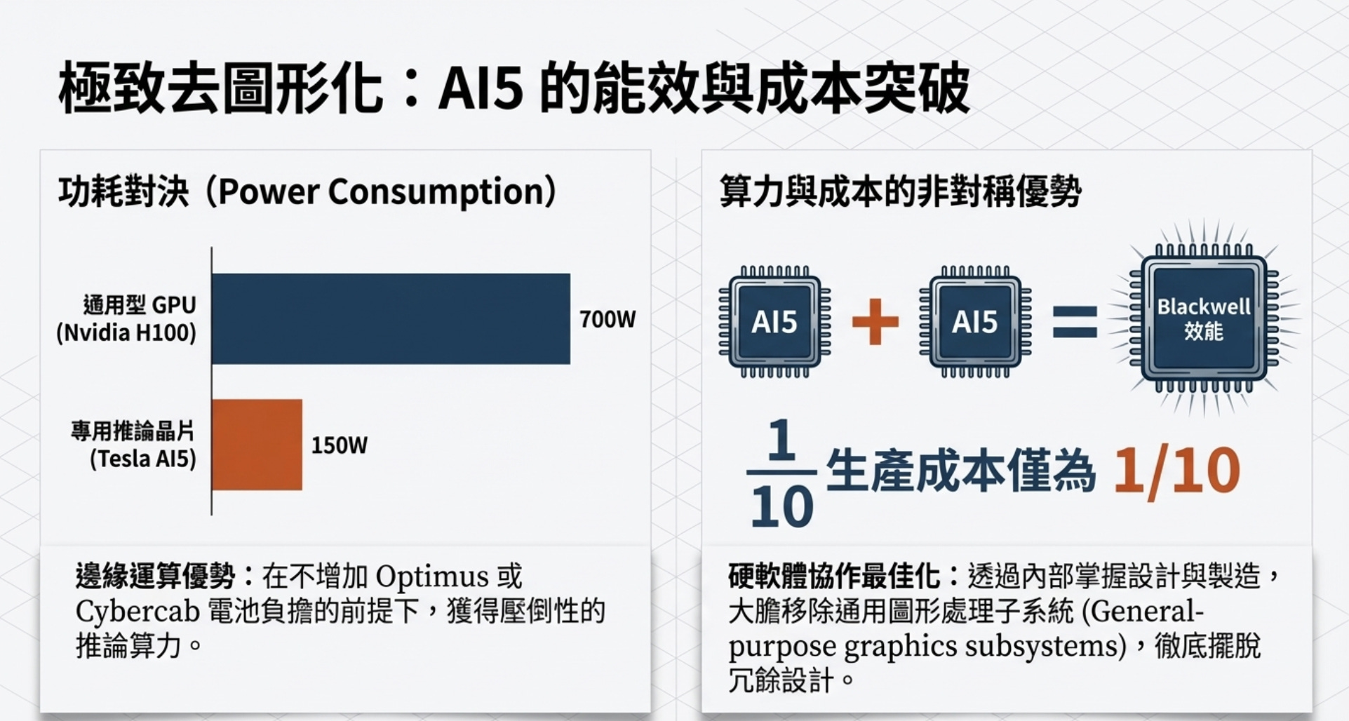 透過內部掌握晶片設計與製造,特斯拉實現了自己的硬軟體協作最佳化,擺脫通用型晶片(GPU)的冗餘設計。以即將量產的AI5晶片為例,特斯拉為了最大化神經網路處理效能,大膽移除了通用圖形處理子系統(General-purpose graphics subsystems)。這帶來了驚人的突破。資料顯示AI5晶片在僅需150瓦的功耗下,便能達到與功耗高達700瓦的Nvidia H100加速器相當的運算效能。更令人矚目的是,兩顆AI5晶片的聯合算力即可匹敵一顆Nvidia最新的Blackwell處理器,更令人期待是生產成本預估為Blackwell晶片的十分之一。這種在功耗與成本上的優勢,讓特斯拉能夠在不增加車輛或機器人電池負擔的前提下,等同先天就遠超競爭對手的能力。