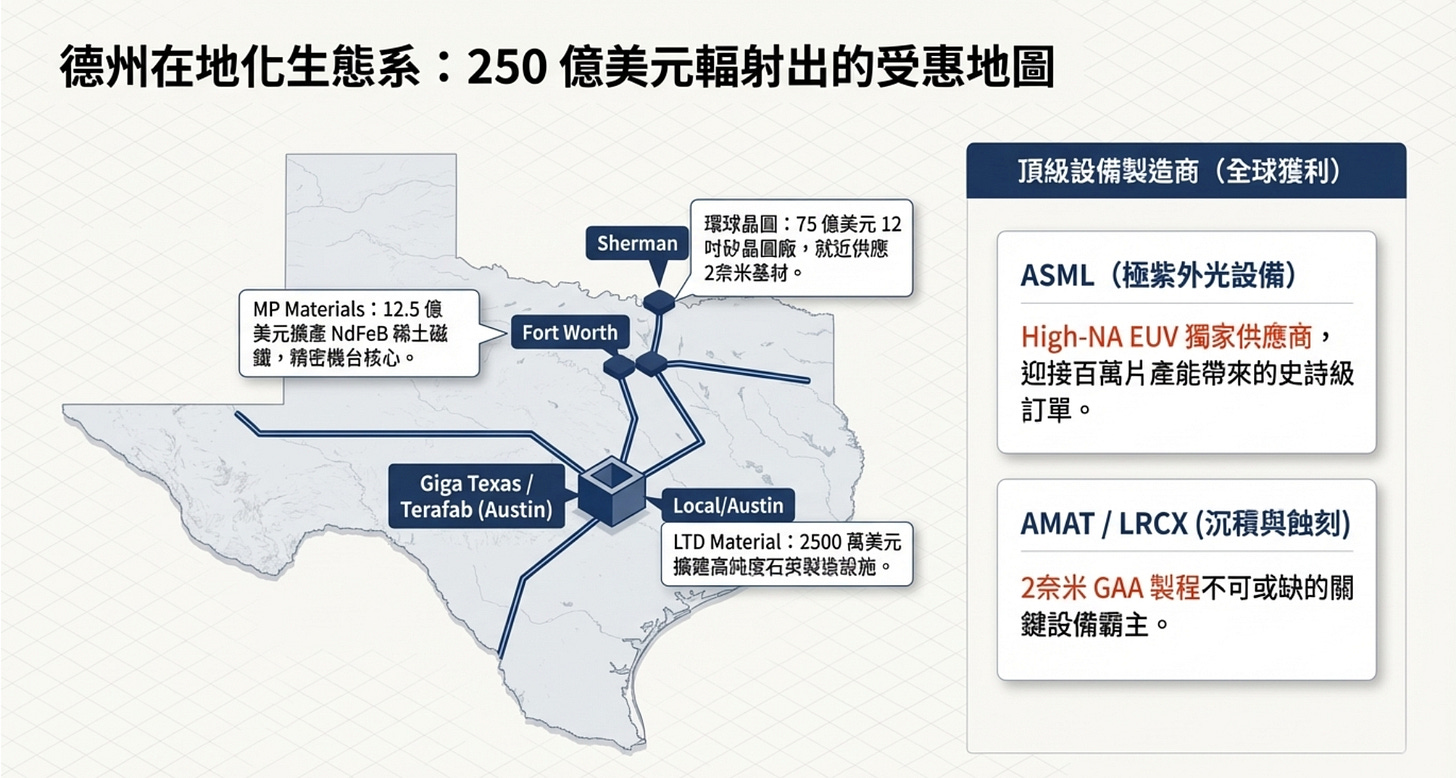 環球晶圓 (GlobalWafers):該公司在德州謝爾曼(Sherman)投資高達75億美元新建的12吋(300mm)矽晶圓廠已於2025年5月啟用。作為美國二十多年來首座先進矽晶圓廠,它獲得了美國《晶片法案》4.06億美元的補助,未來將就近為特斯拉Terafab提供生產2奈米晶片所需的基礎矽晶圓基材,降低跨國運輸風險。