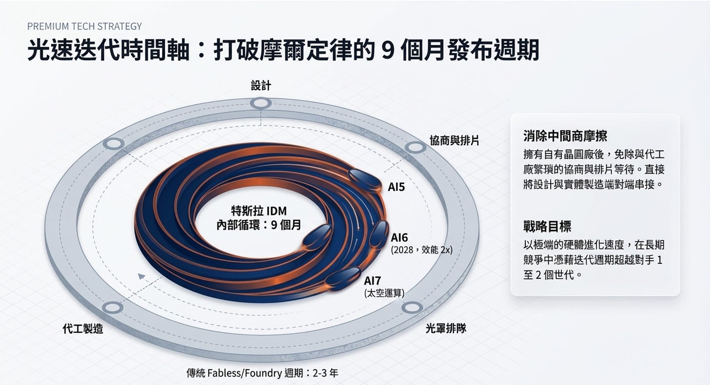 傳統半導體晶片的設計與代工週期極長,通常以年為單位進行迭代。然而特斯拉計畫導入激進的「九個月發布週期」。在AI5之後,特斯拉已經規劃了AI6(預計2028年推出,效能為AI5的兩倍)與專為太空運算設計的AI7。這種硬體迭代速度,只有在擁有自有晶圓廠、免除與代工廠繁瑣的協商、光罩製作排隊與排片等待的情況下才能實現。以長期來看,特斯拉想要用AI硬體進化速度去超越自己競爭對手一到兩個世代。