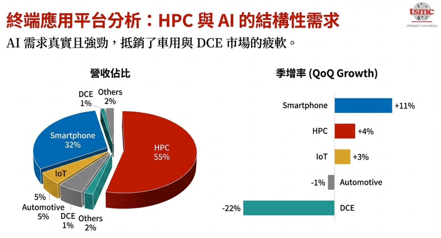 高效能運算 (HPC): 佔比 55%(含 AI 需求,季增 4%)。