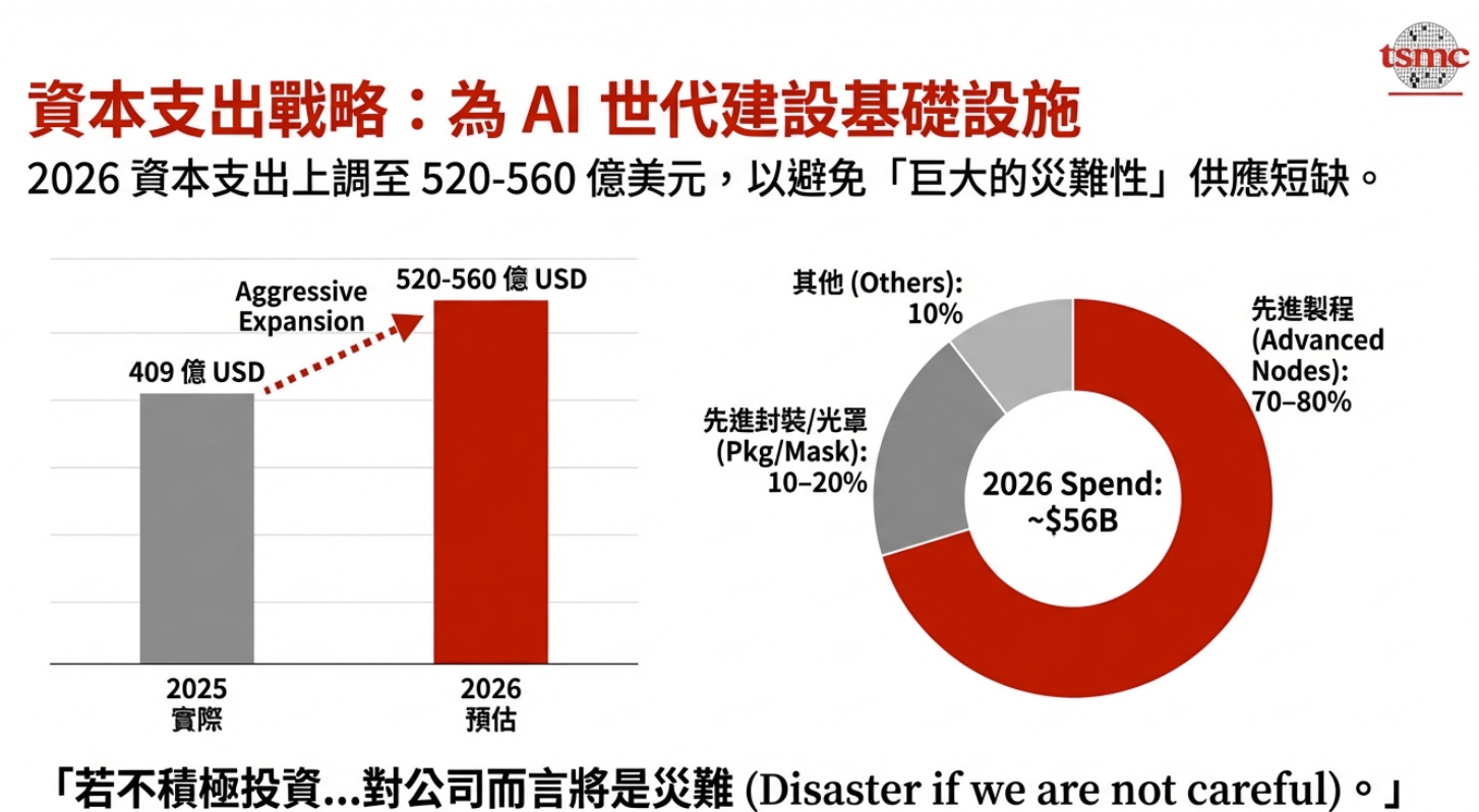 台積電計畫在 2026 年投入 520 億至 560 億美元 的資本支出,較 2025 年的 409 億美元顯著增長。資金用途分配如下: