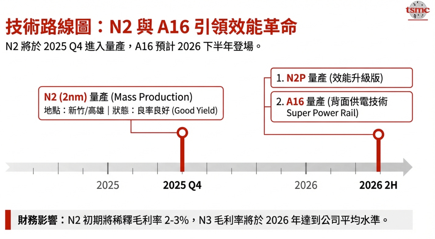 2 奈米 (N2): 已於 2025 年第四季在新竹與高雄廠進入量產階段,良率表現良好。