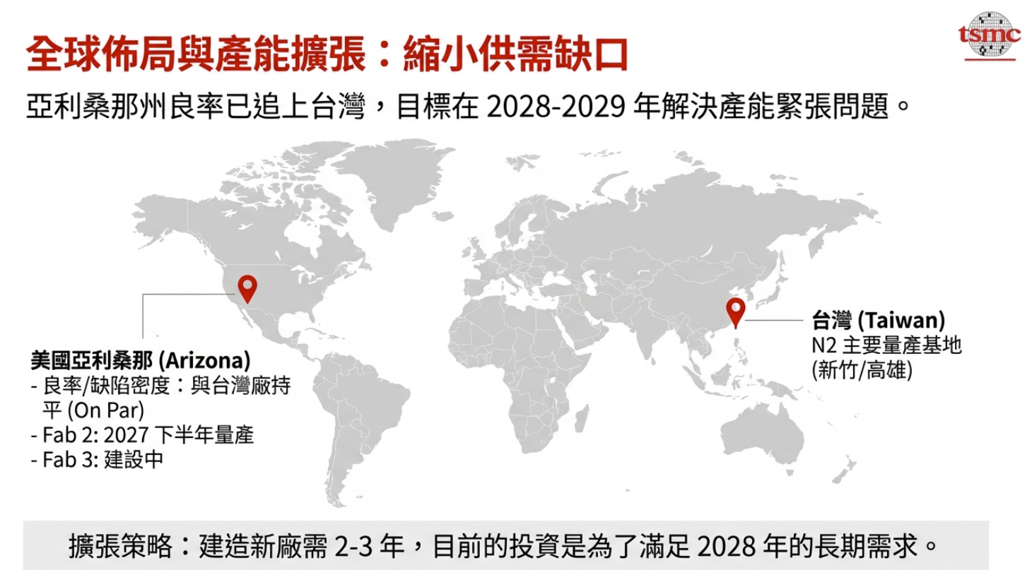 亞利桑那州: 良率與缺陷密度表現與台灣工廠持平。