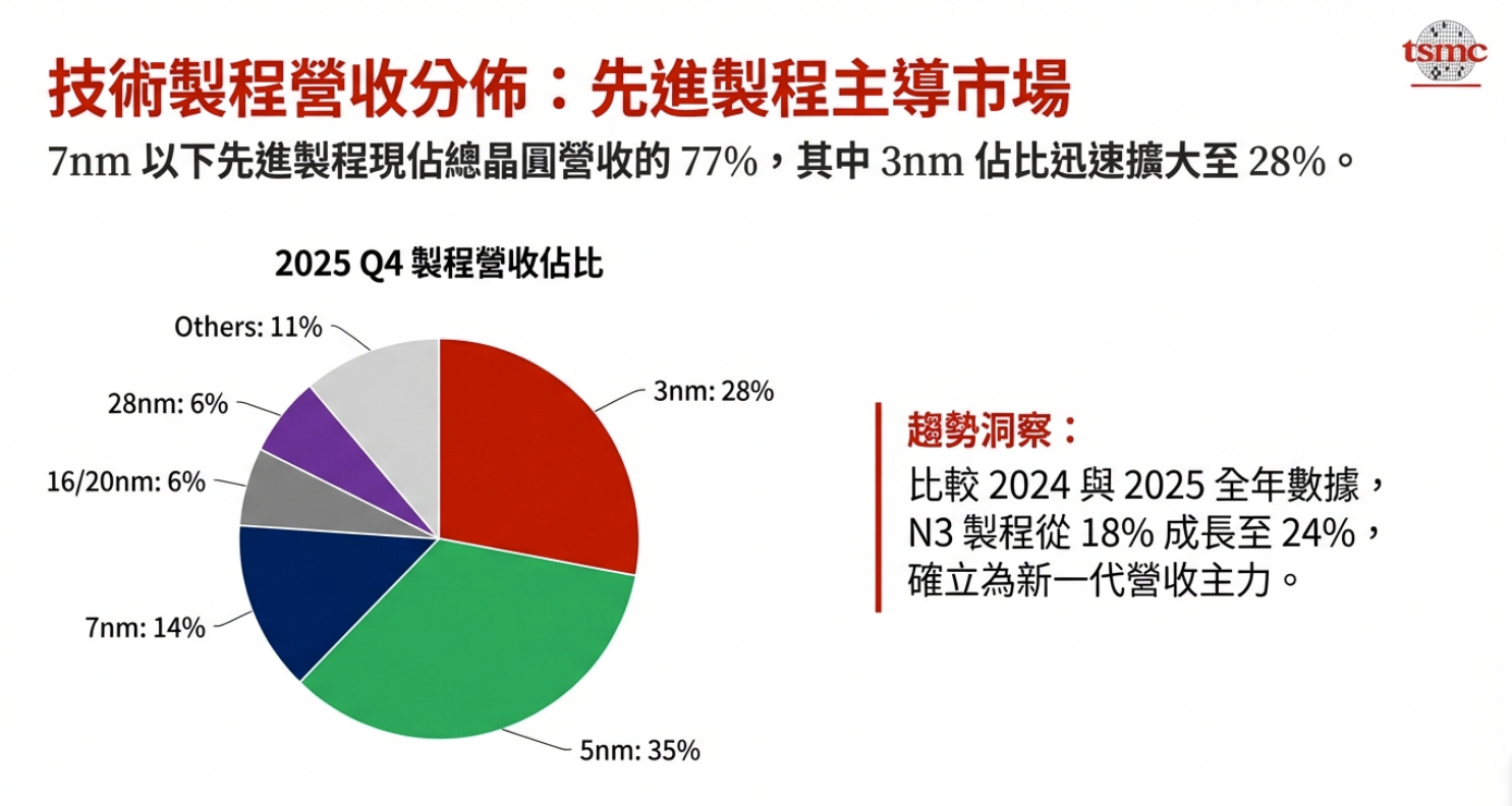 先進製程(7 奈米及以下)已成為營收的核心支柱,佔 2025 年第四季晶圓總收入的 77%。
