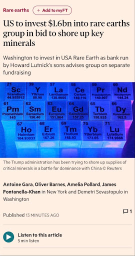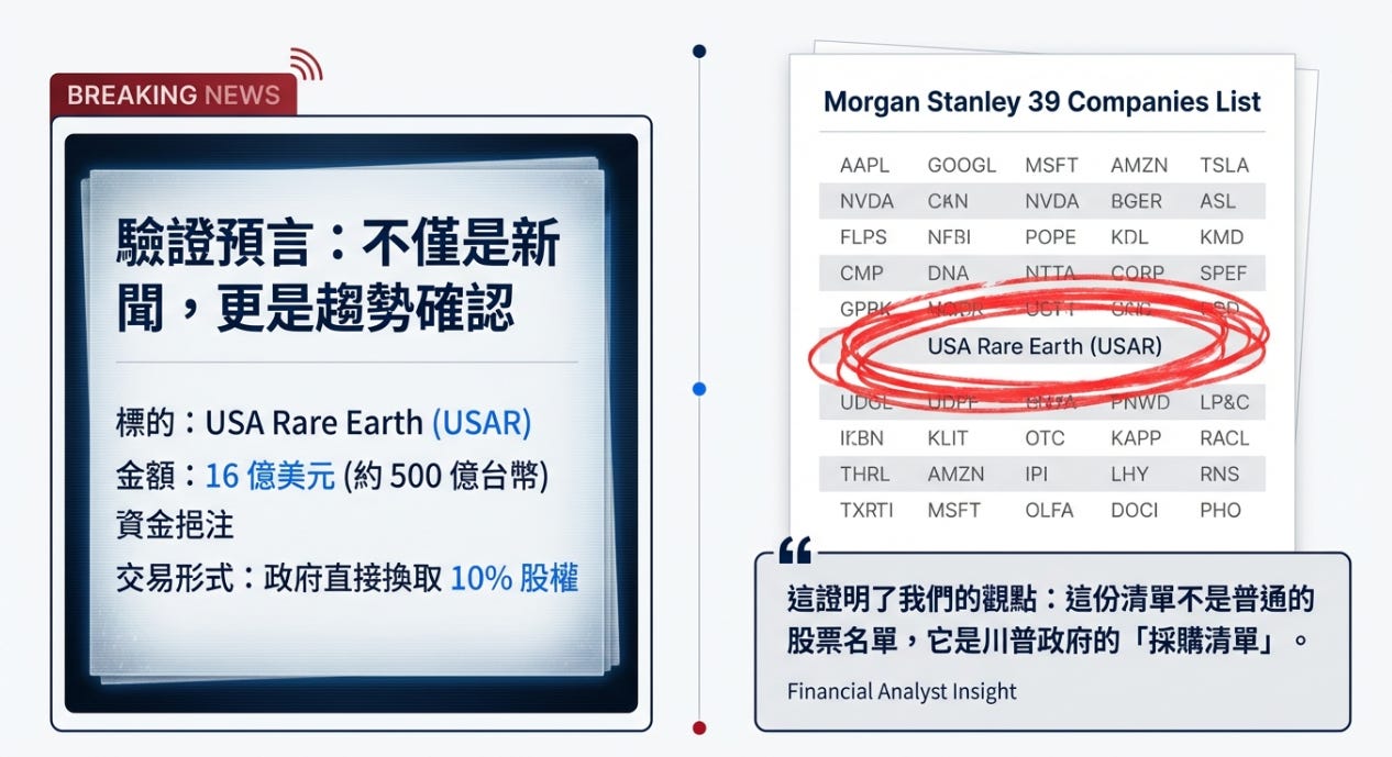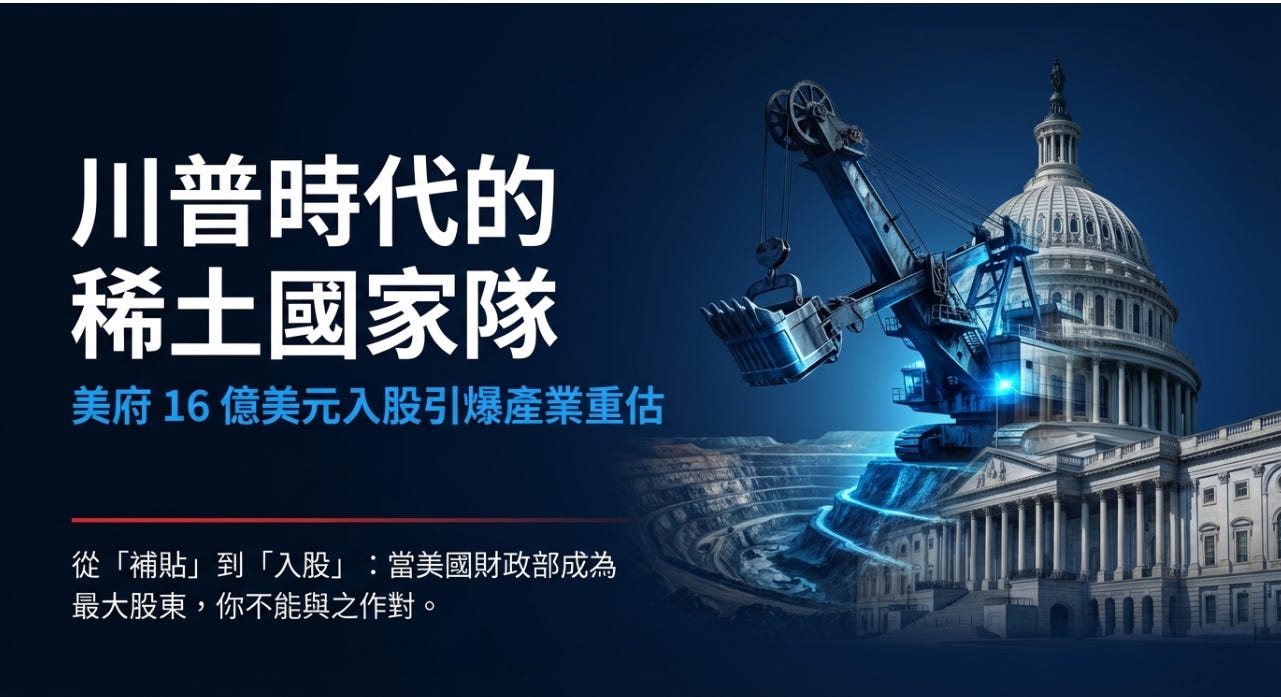 從 USAR 的 16 億美元交易,看懂川普的「稀土國家隊」佈局USAR 只是開始。這兩個「已經量產」的巨頭,才是這波資金潮的最大受益者。大叔美股筆記 Uncle Stock NotesJan 25, 2026∙ Paid276196Share美國政府正式下場買股票就在剛剛,英國《金融時報》(FT)拋出川普政府計畫向 USA Rare Earth #USAR 投資 16 億美元,換取 10% 股權。這是美國政府直接寫支票買股票。請大家回頭看看幾天前那張 「摩根士丹利 39 家戰略公司清單」,在 「稀土與戰略金屬」 那一欄:USA Rare Earth(USAR)赫然在列。代表是政府早就畫好的產業路線圖,現在正式落子。Continue reading this post for free, courtesy of 大叔美股筆記 Uncle Stock Notes.Claim my free postOr purchase a paid subscription.