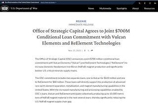 Office of Strategic Capital 同意與 Vulcan Elements 和 ReElement Technologies 共同提供 7 億美元的有條件貸款承諾。