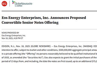 Eos Energy Enterprises, Inc. 宣布擬發行可轉換優先票據